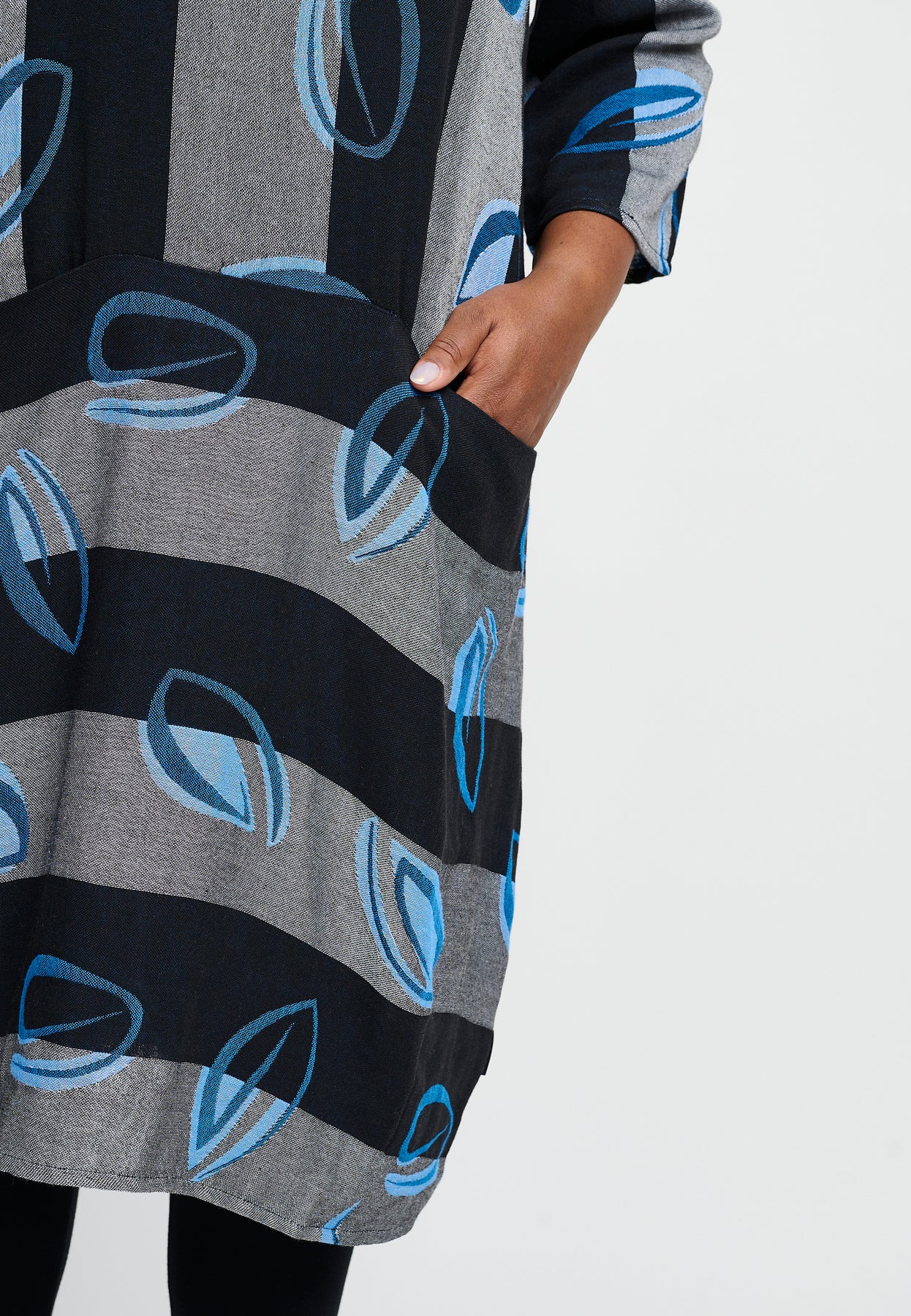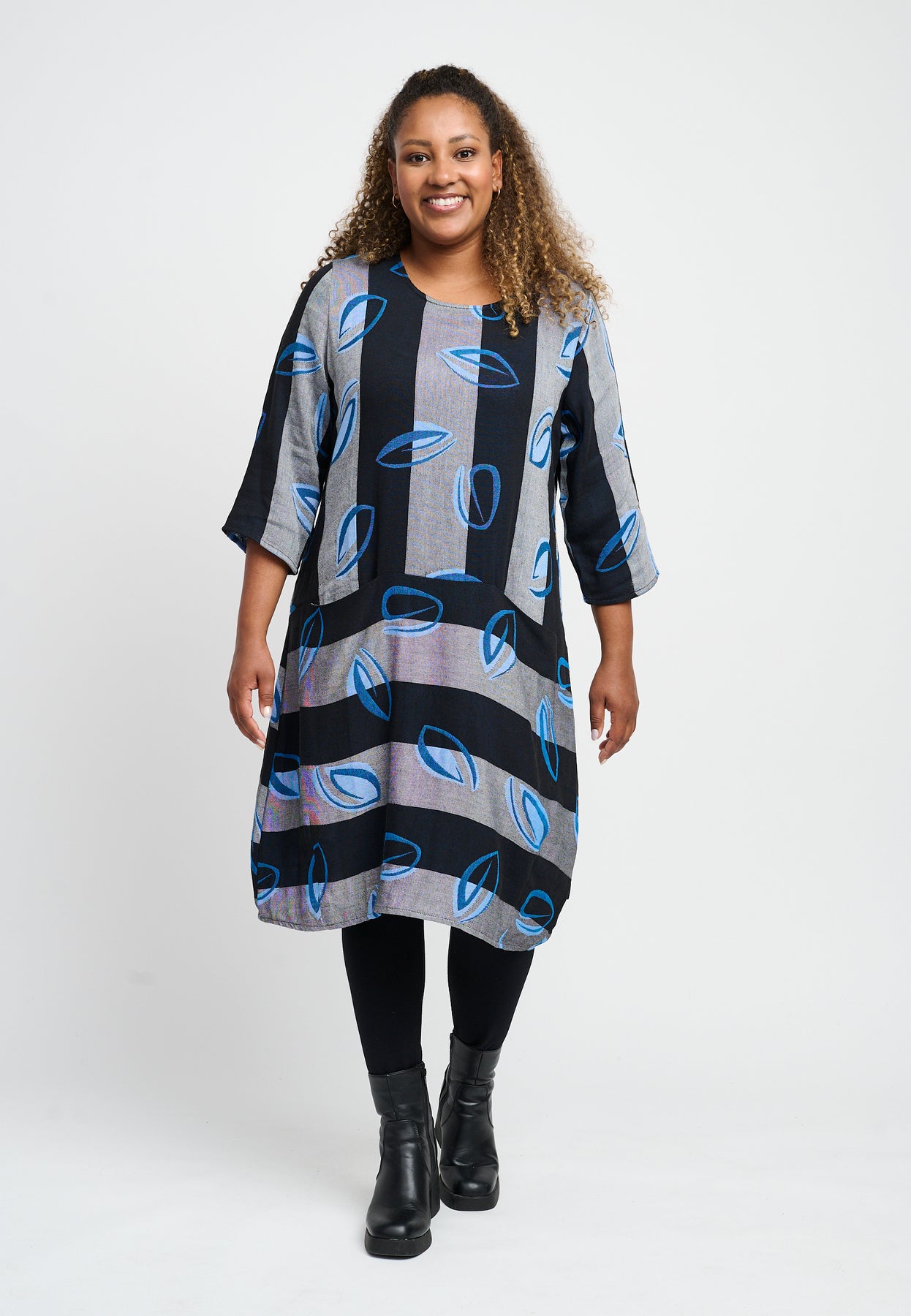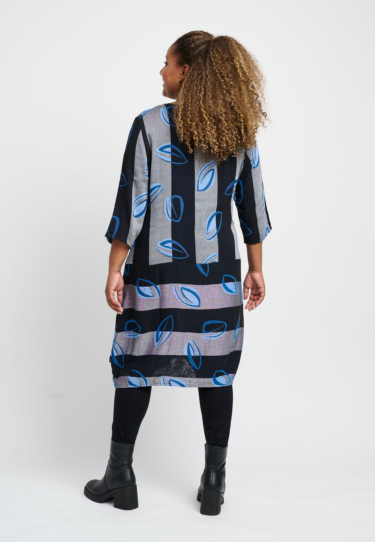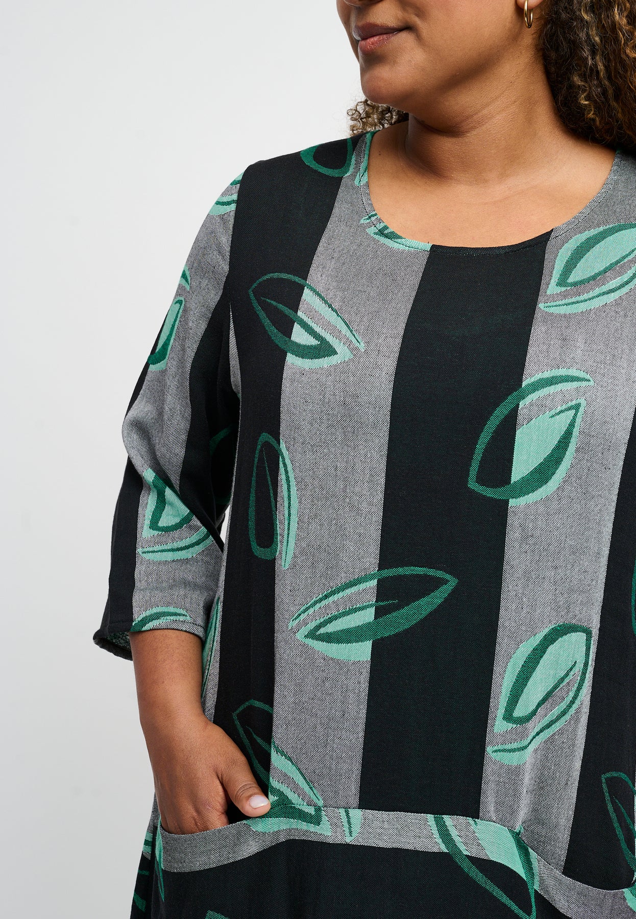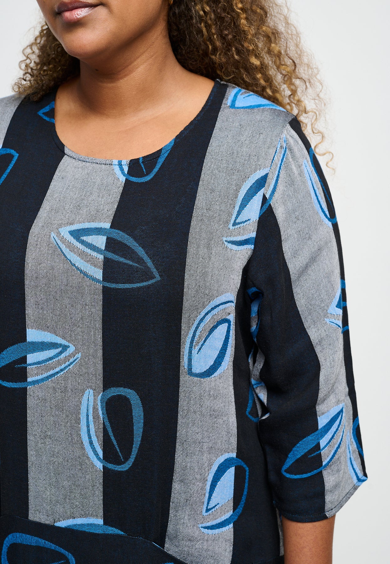 Nice dress with ¾-length sleeves, a round neck, and side pockets. It has a cool design with wide stripes and a stunning print. The dress is made from an exclusive linen blend, and the fit has a slight balloon effect.