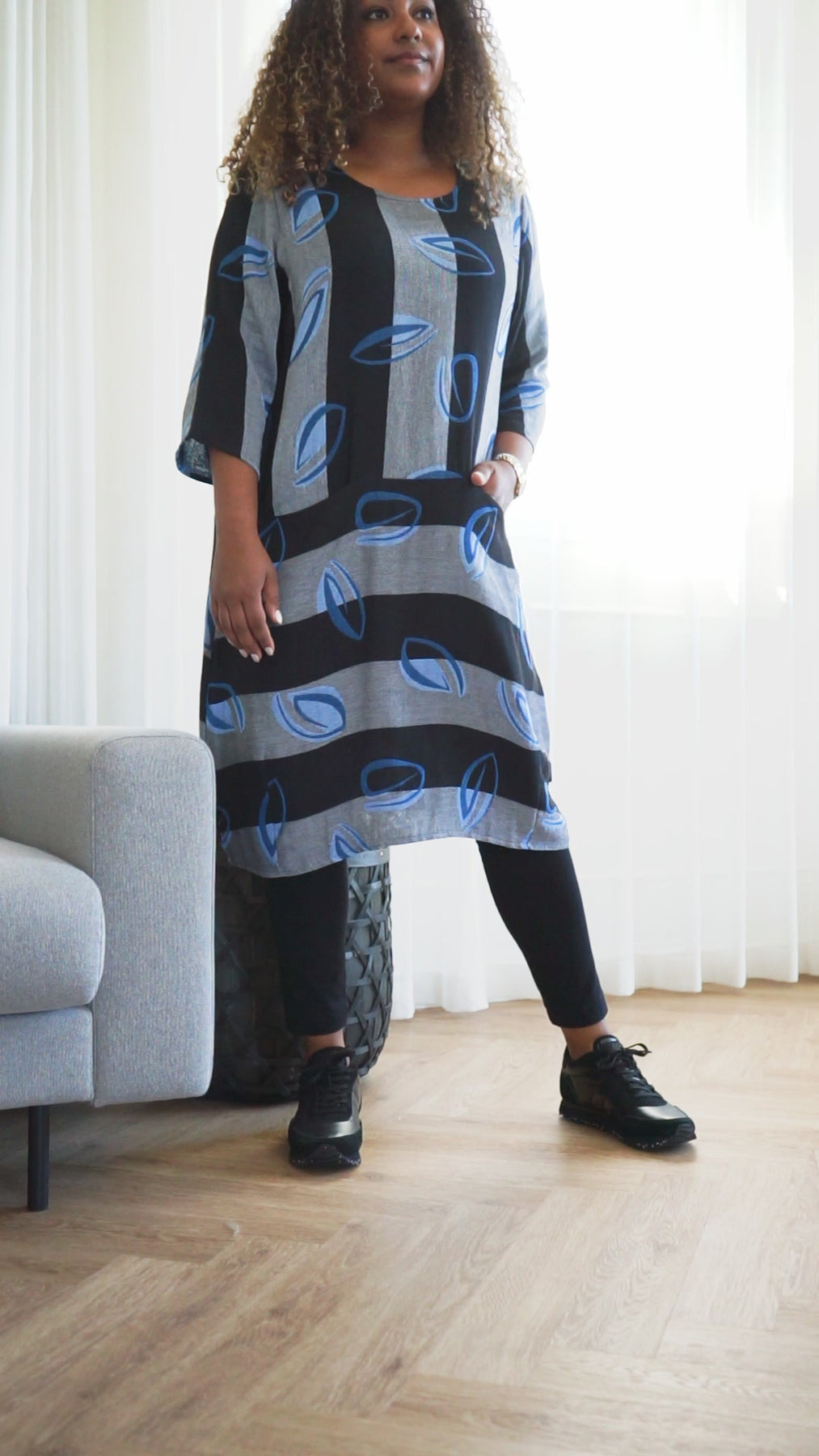 The style is called Inger and is made from 50% cotton, 45% viscose and 5% linen. The fit is 'Balloon Effect' and it is 105 cm long in the back.