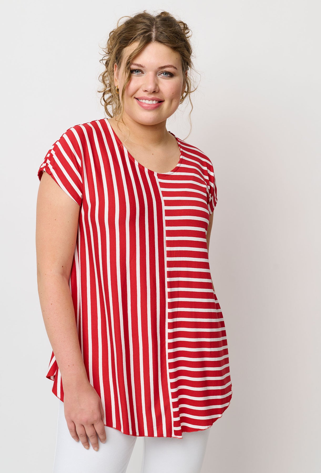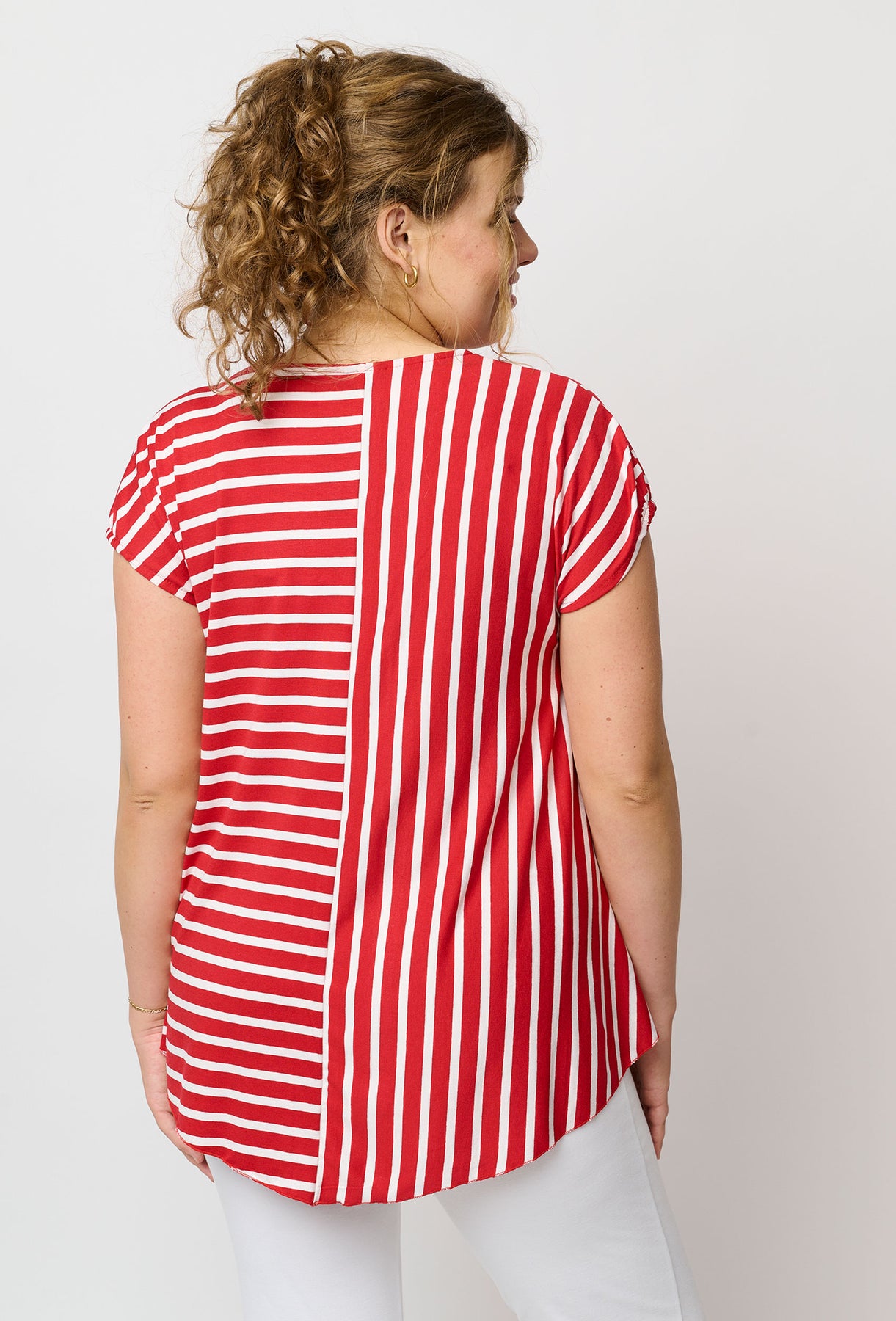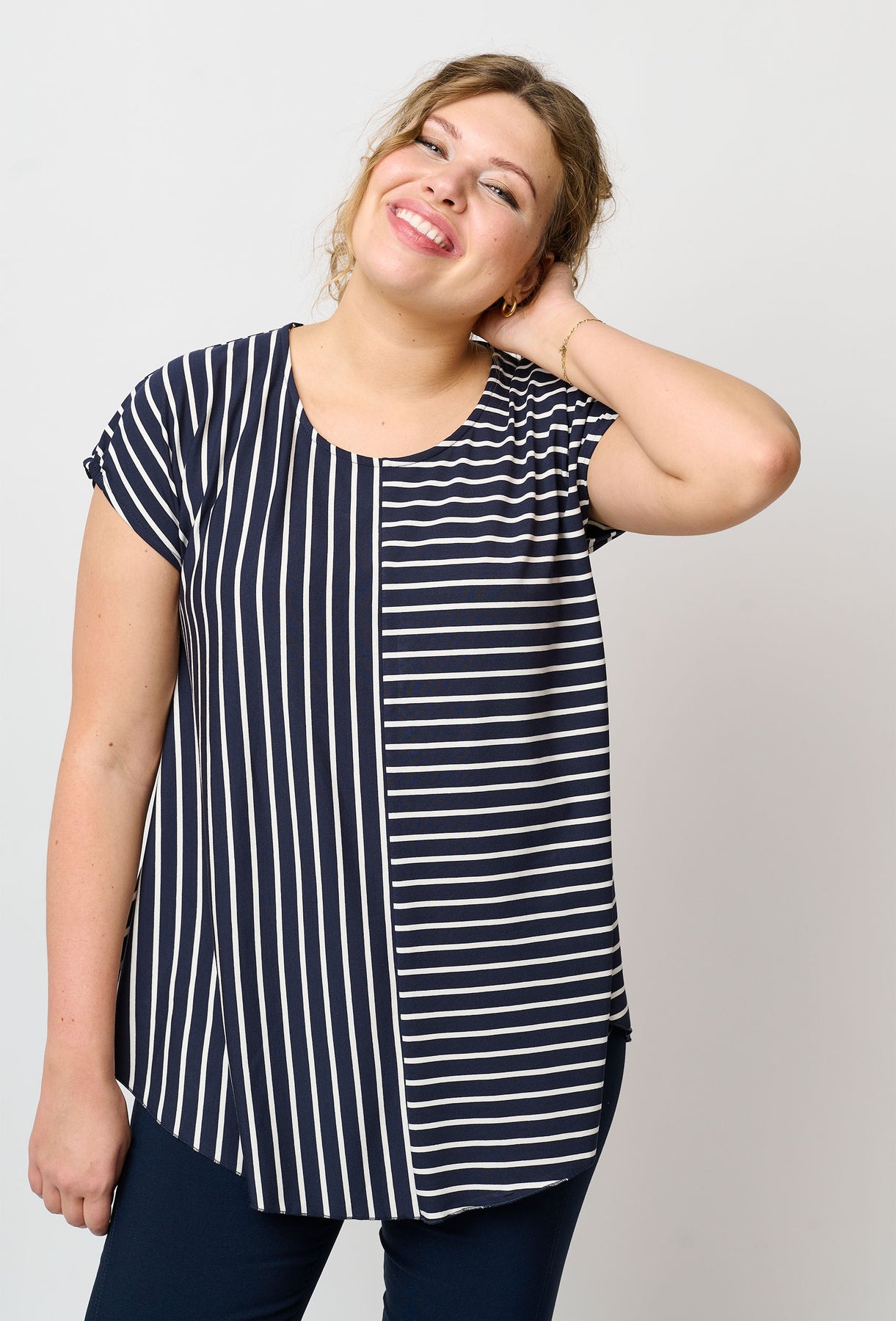 Beautiful, short tunic with a round neckline, short sleeves and a two-tone, horizontal and vertical striped design. The tunic is made from the best viscose quality with lots of stretch that emphasizes the feminine, A-shaped fit.