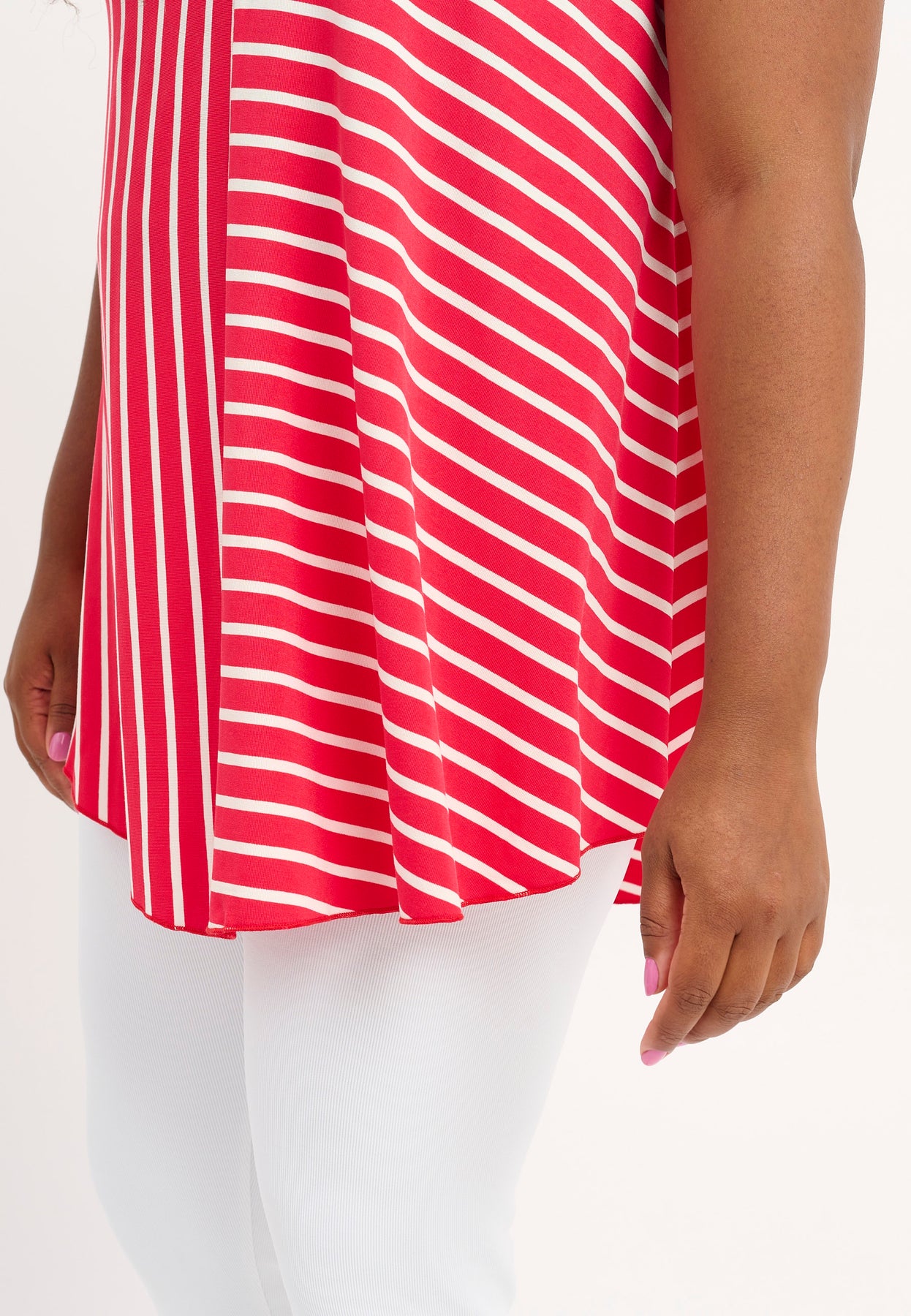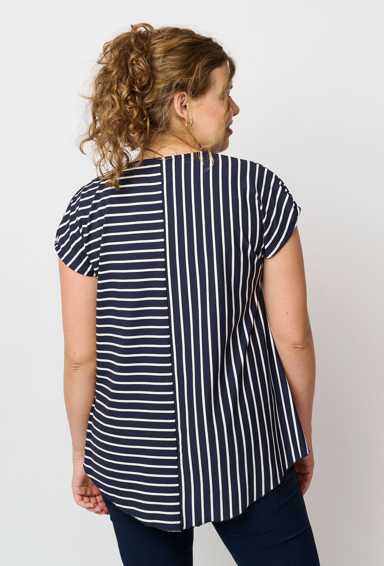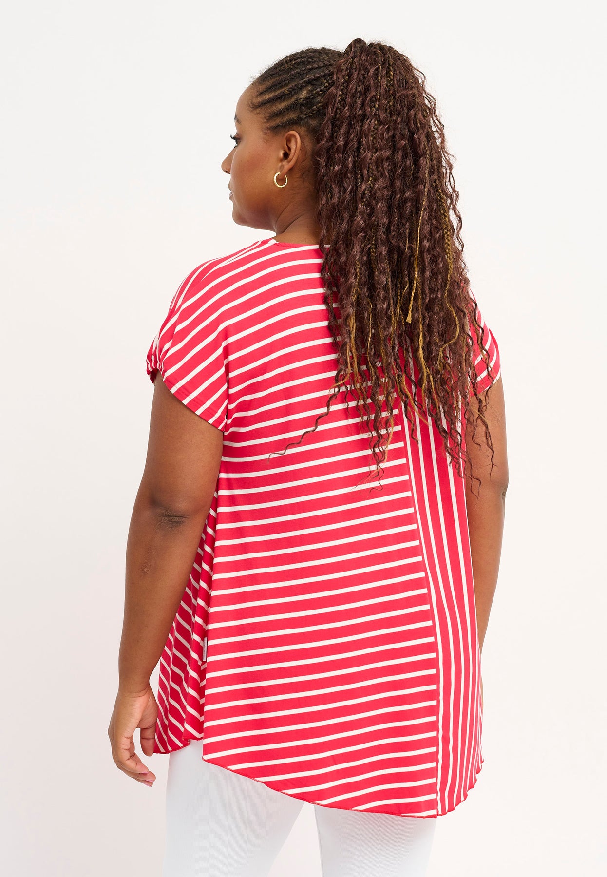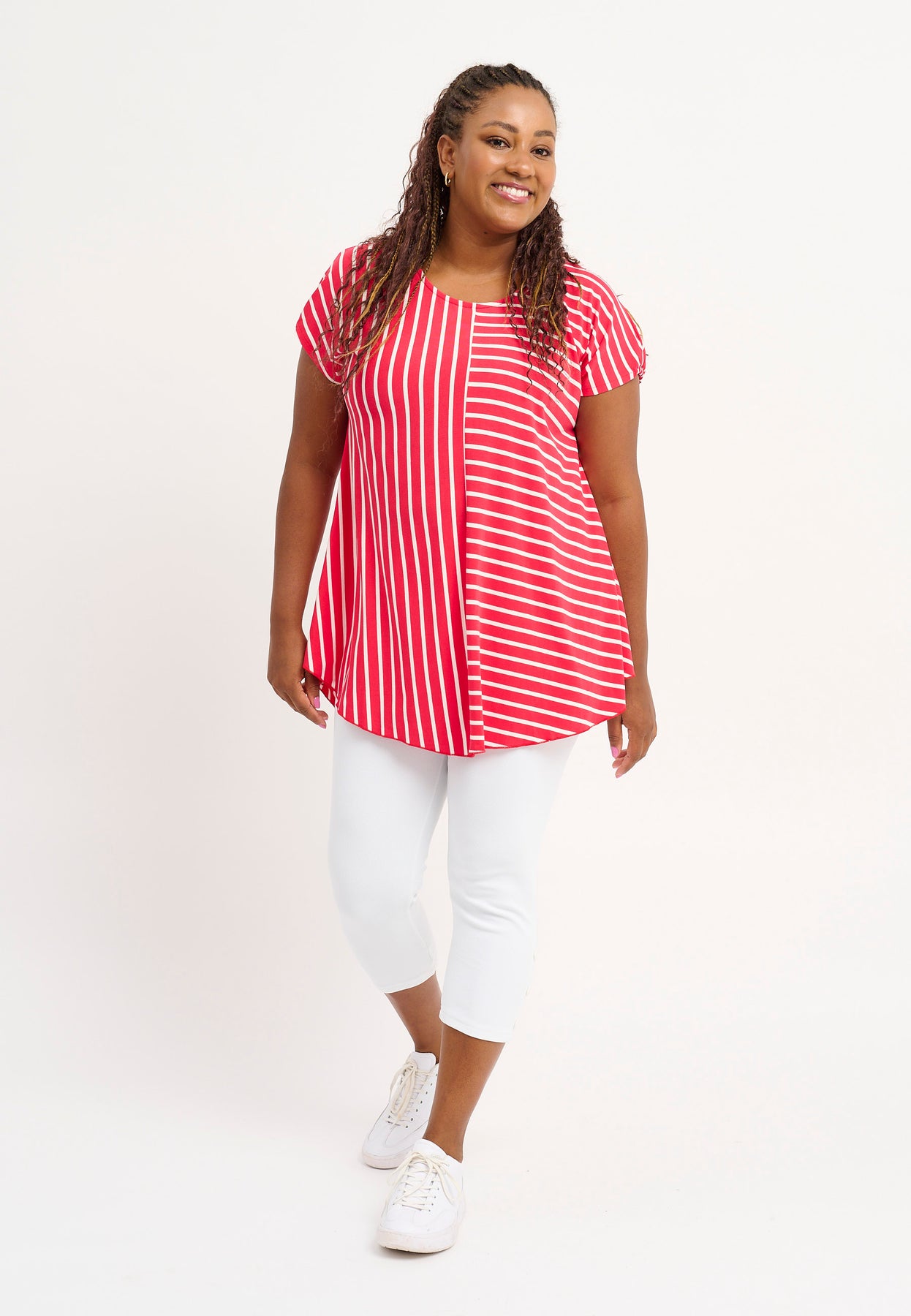 Beautiful, short tunic with a round neckline, short sleeves and a two-tone, horizontal and vertical striped design. The tunic is made from the best viscose quality with lots of stretch that emphasizes the feminine, A-shaped fit.