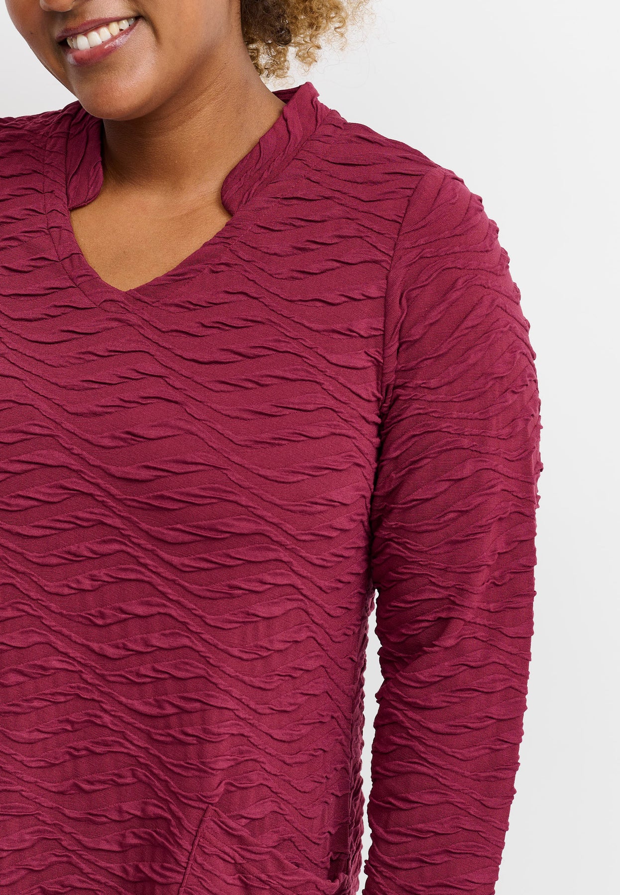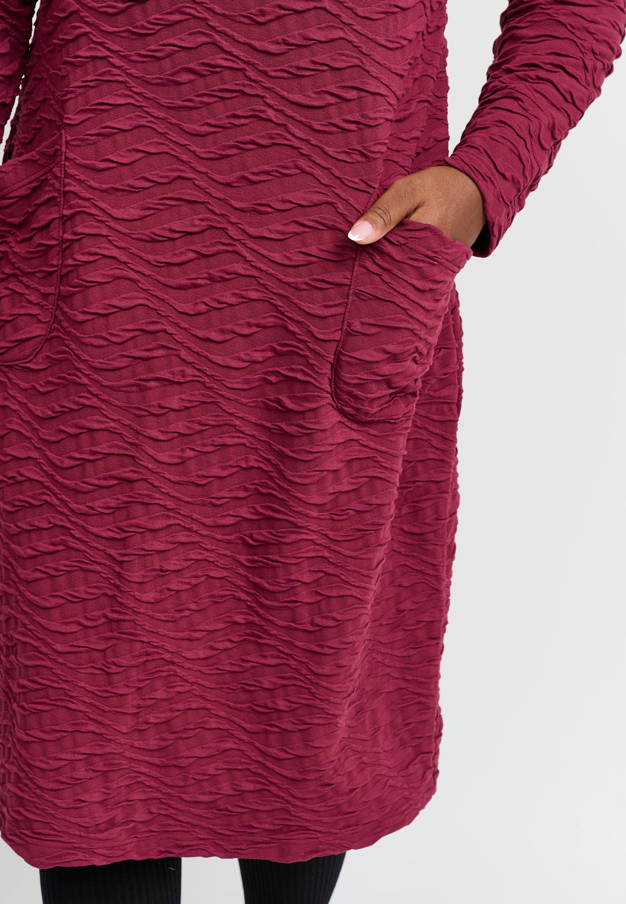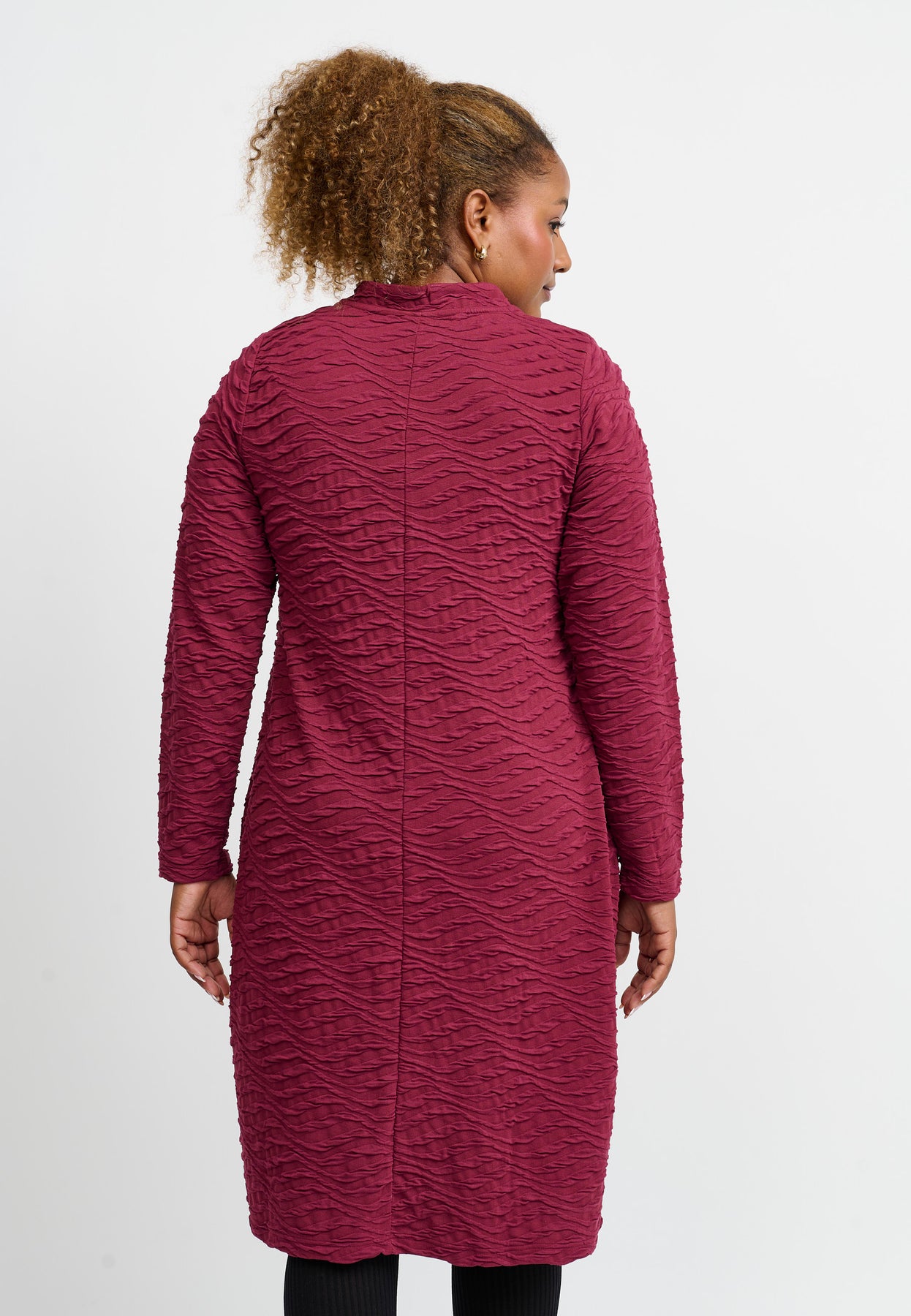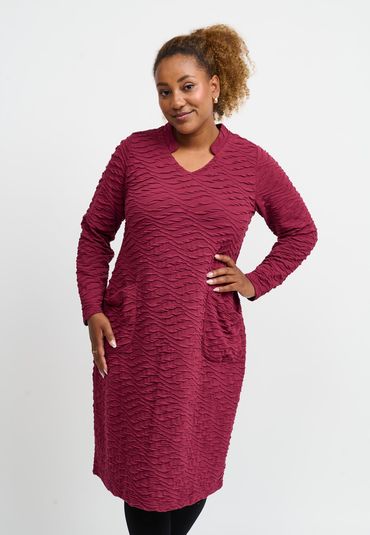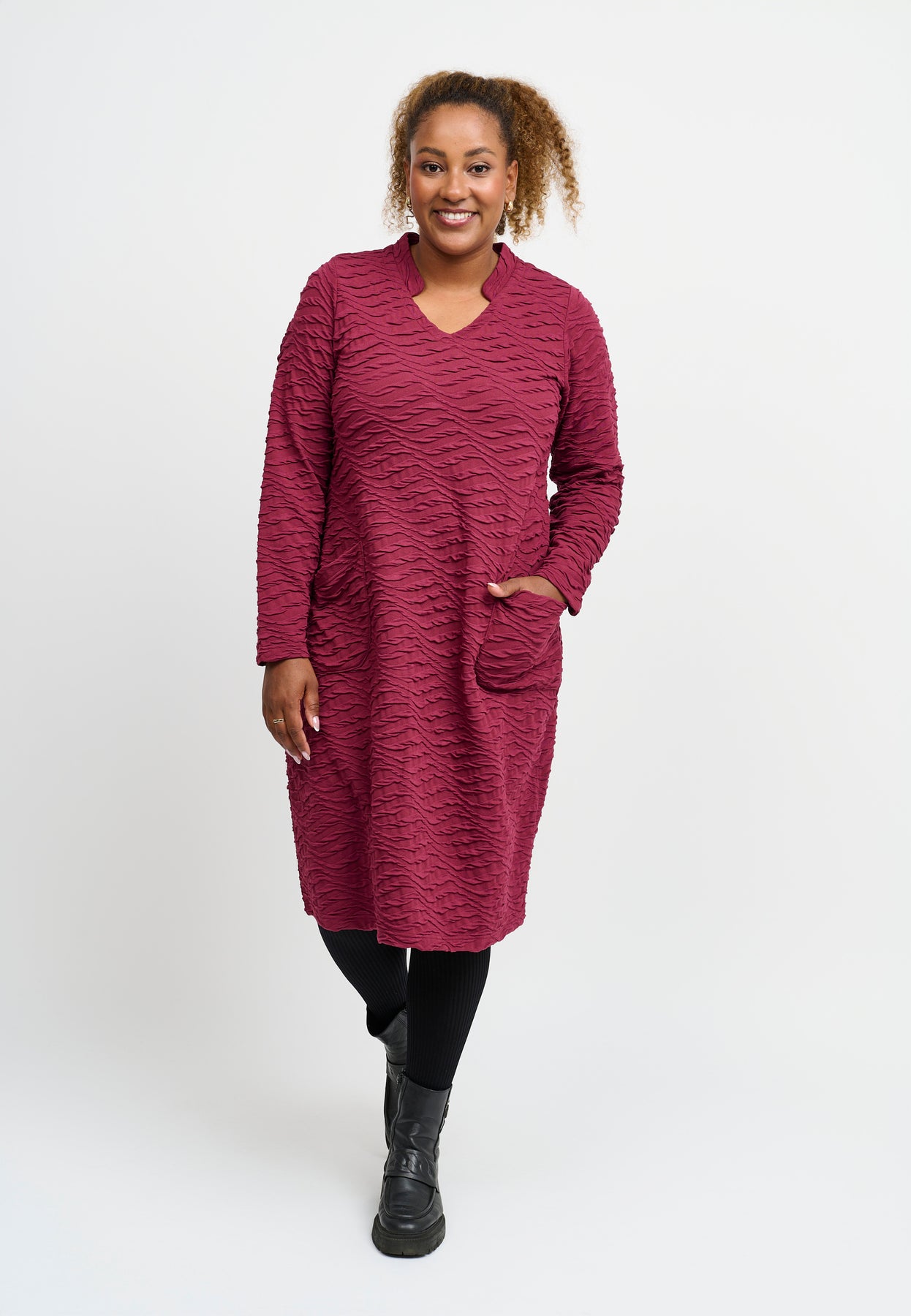 A lovely structured dress with a straight cut and a simple, elegant look. The beautiful bordeaux color and subtle surface texture add character, while the round neckline and long sleeves provide a classic feel. The material is soft and stretchy with a gentle firmness that ensures shape and comfort all day.