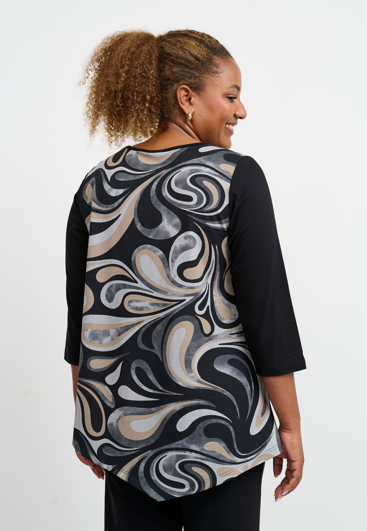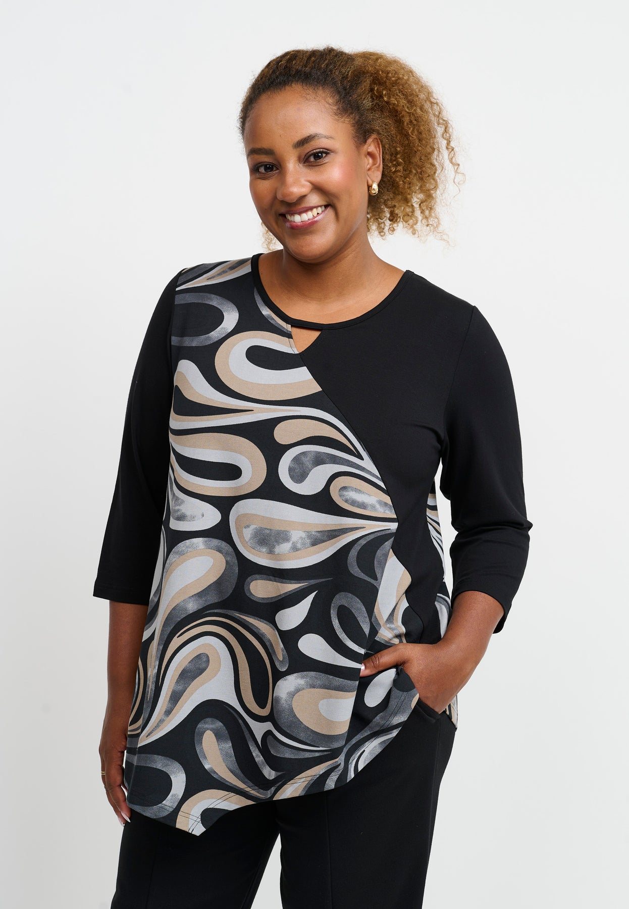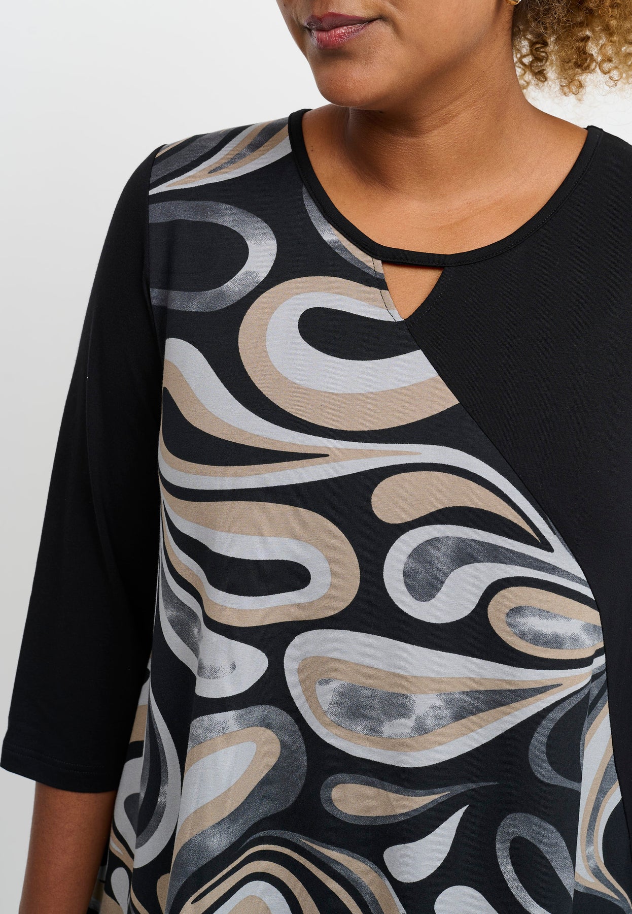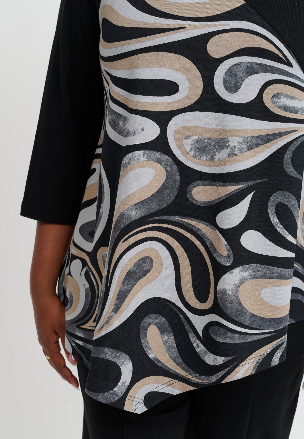 Regular price 649.00 DKK Sale price 324.50 DKK Save 50%A striking top with an asymmetric design that combines black with an artistic, graphic print. The A-shape cut creates a relaxed drape, while the viscose blend with stretch ensures comfort and flexibility. The 3/4-length sleeves and softly rounded neckline add an elegant touch to the modern look.