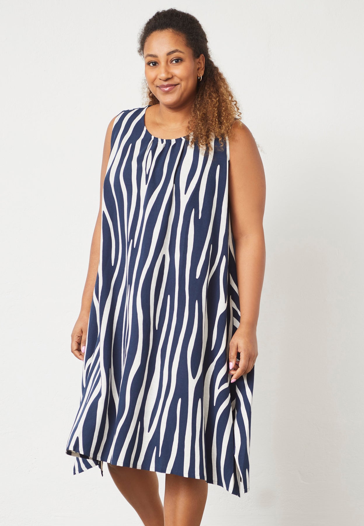 A light and elegant dress with a dynamic striped pattern and an airy fit. The fabric combines viscose and linen, giving it a soft structure and a breathable, comfortable feel. The A-shape cut ensures a beautiful silhouette, while the sleeveless design enhances its summery appeal.