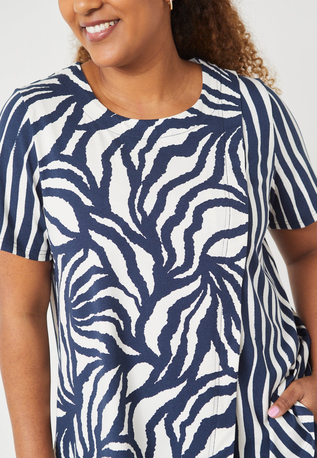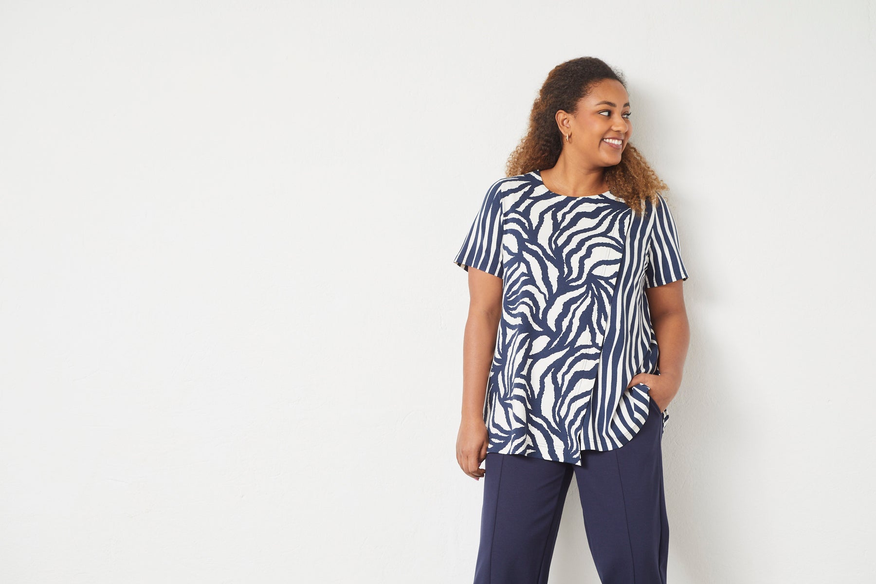 This t-shirt is a wardrobe favourite. It’s made from soft and flexible viscose with a flattering A-shape and short sleeves. The graphic print adds a modern touch, while the classic round neckline keeps the look relaxed.