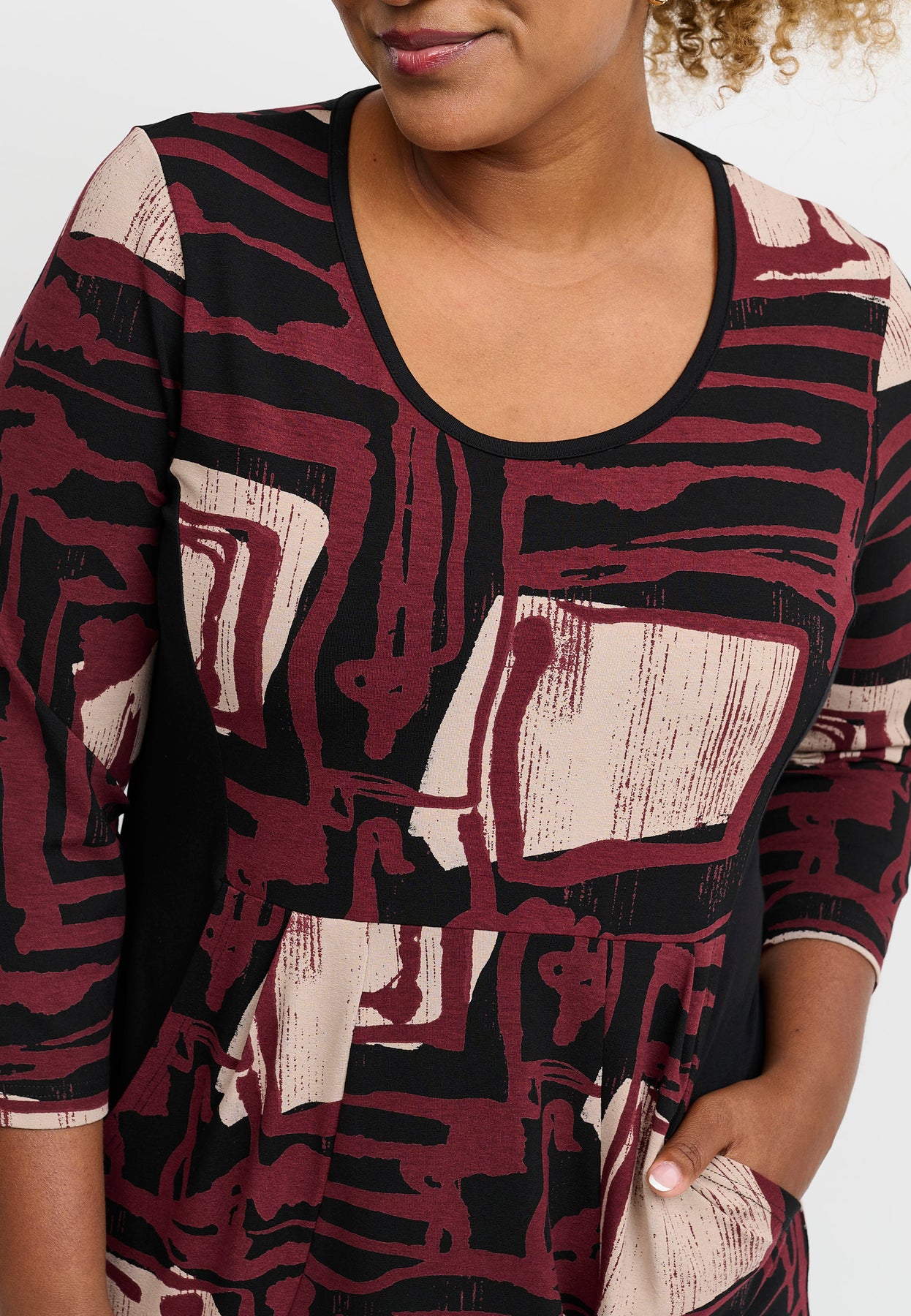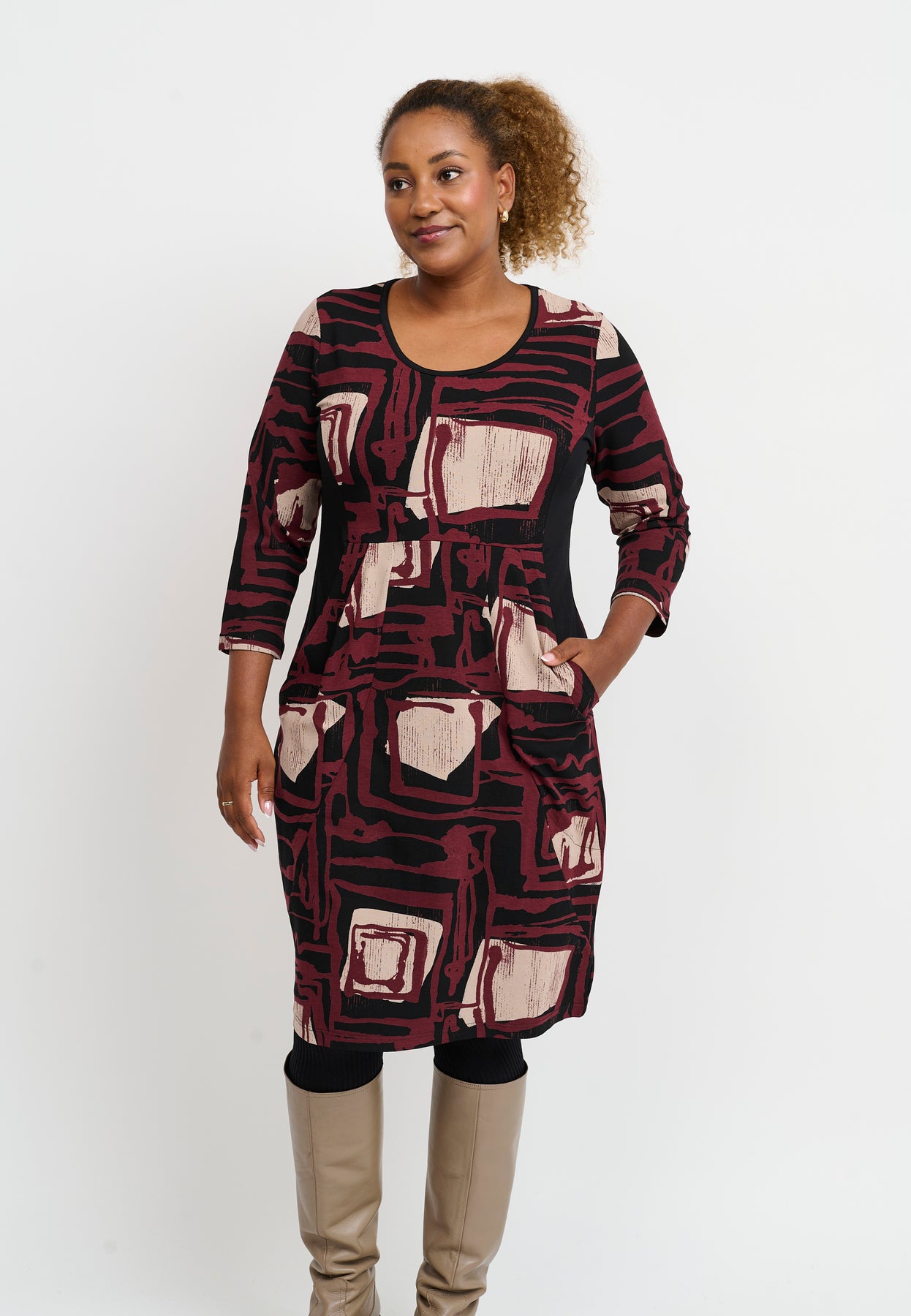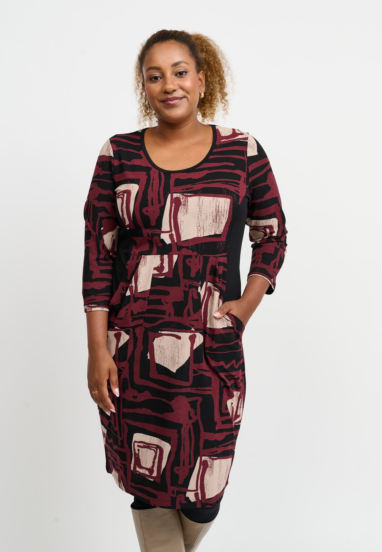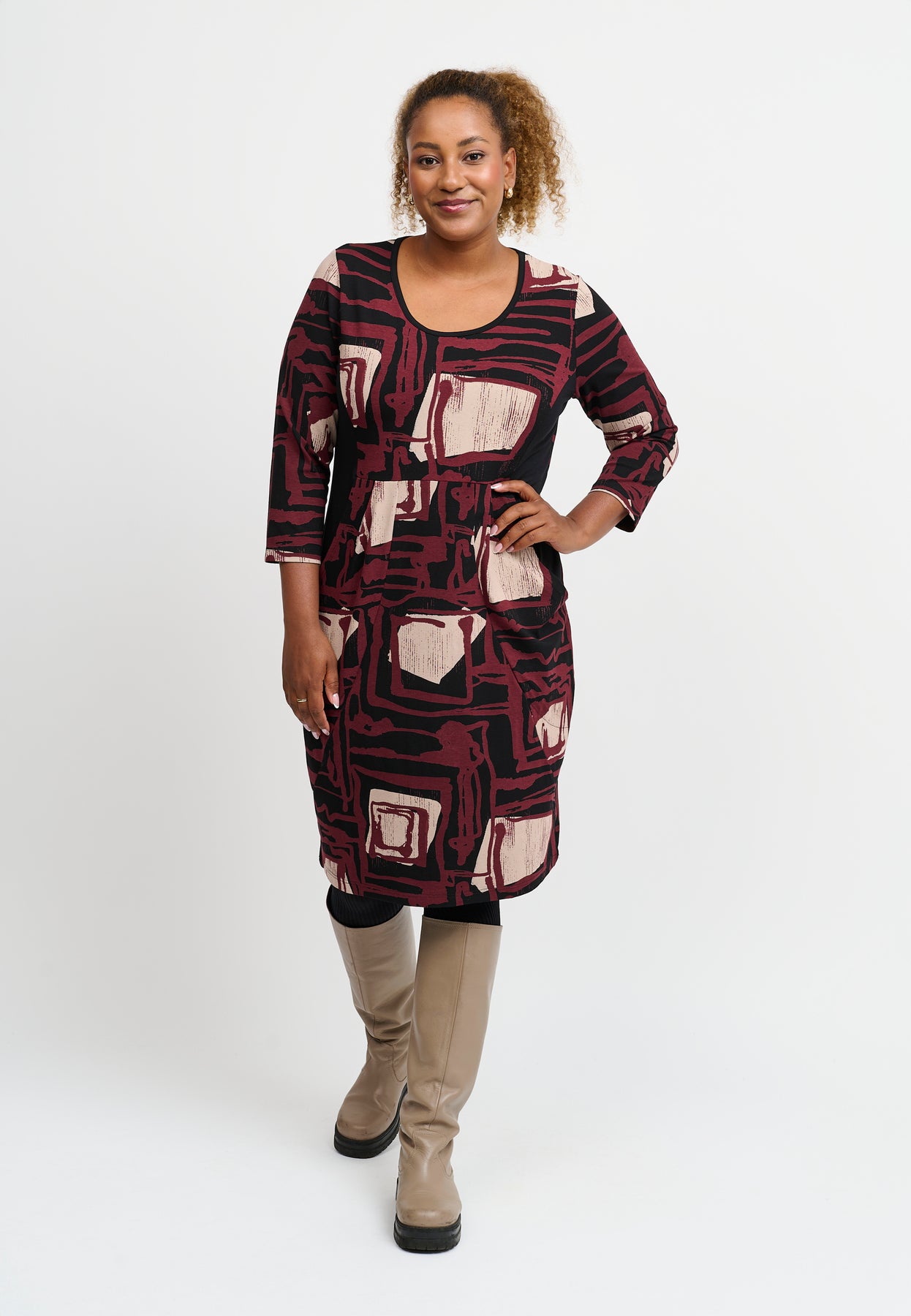 A creative and comfortable dress with a balloon effect and a modern patch-inspired print. The gently rounded silhouette provides a flattering shape with great freedom of movement. The soft viscose jersey with elastane ensures all-day comfort – ideal for both everyday wear and social events.