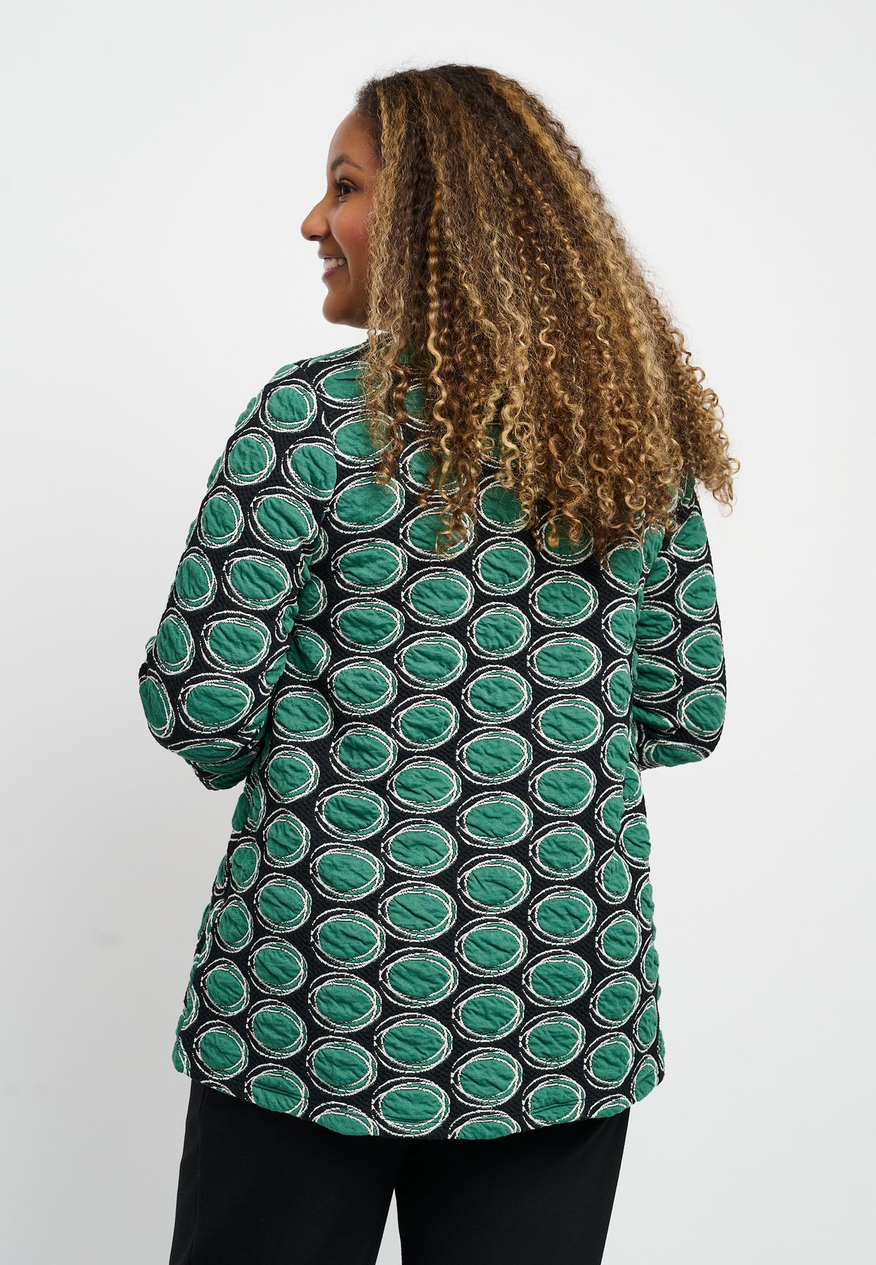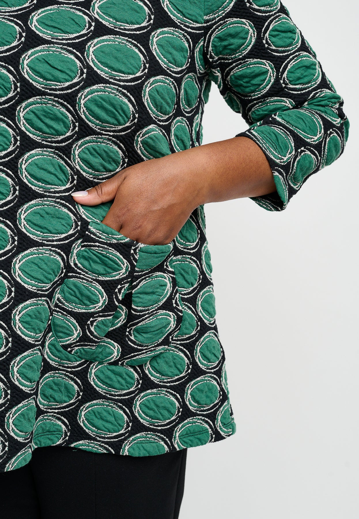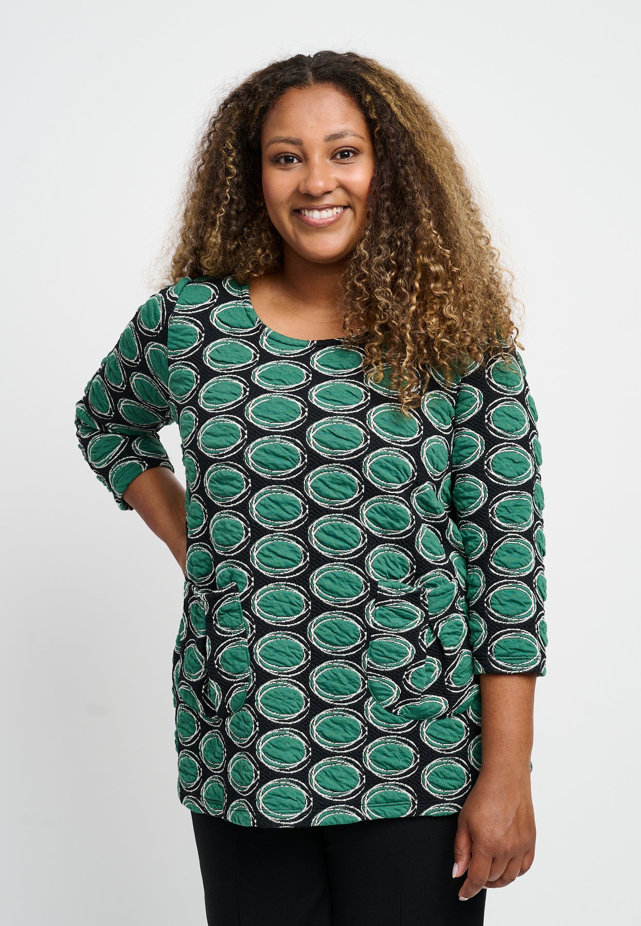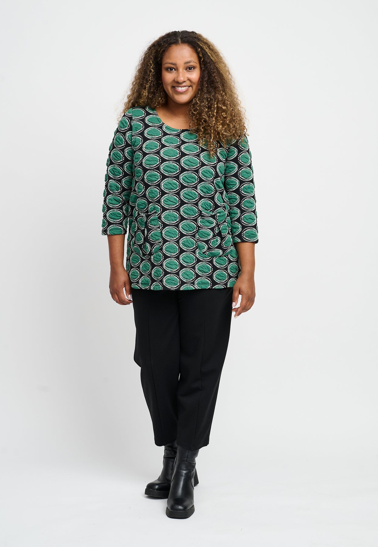 Regular price 799.00 DKK Sale price 399.50 DKK Save 50%Nice blouse with ¾-length sleeves and a round neckline. It has practical side pockets and a cool, patterned design in green colors. The blouse is made from a soft viscose blend with a great stretch that emphasizes the A-shaped fit.