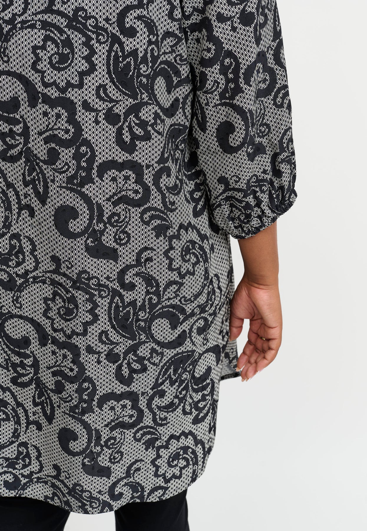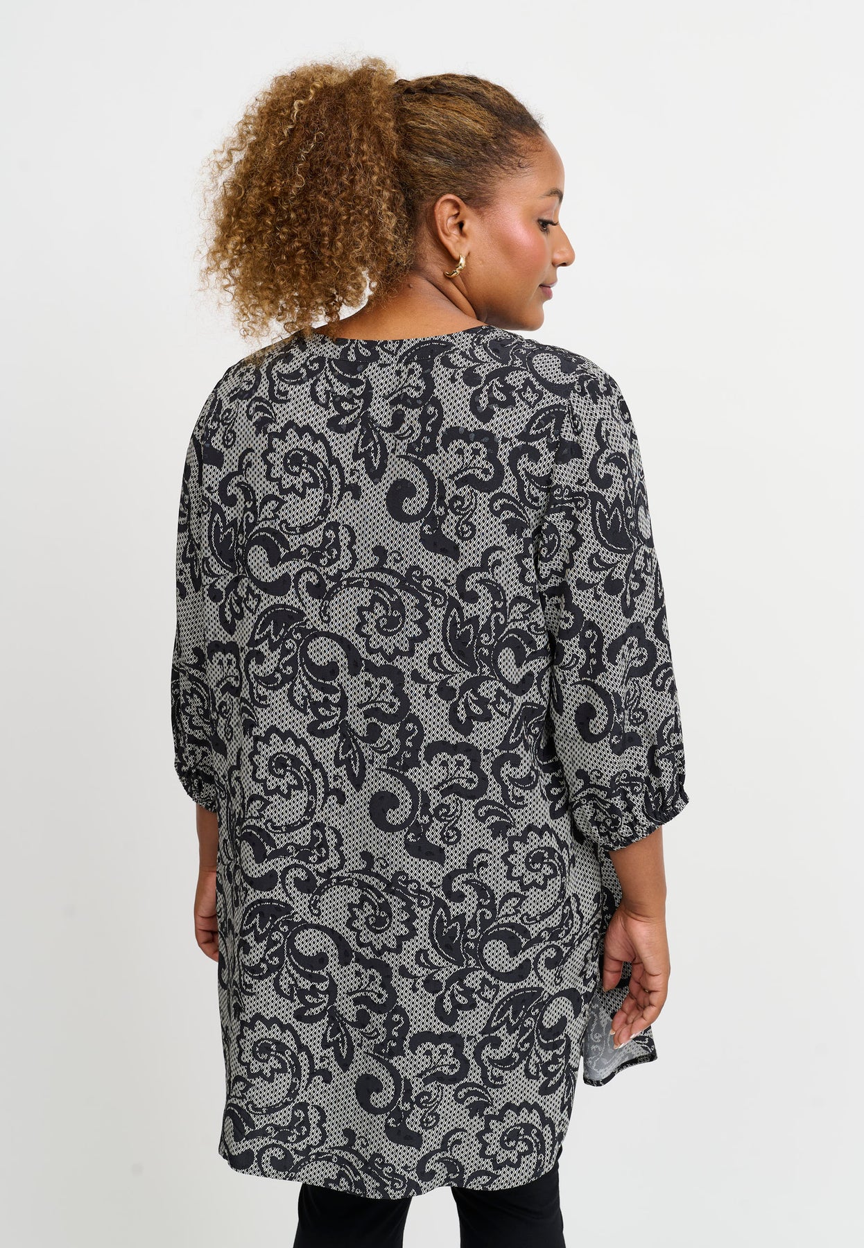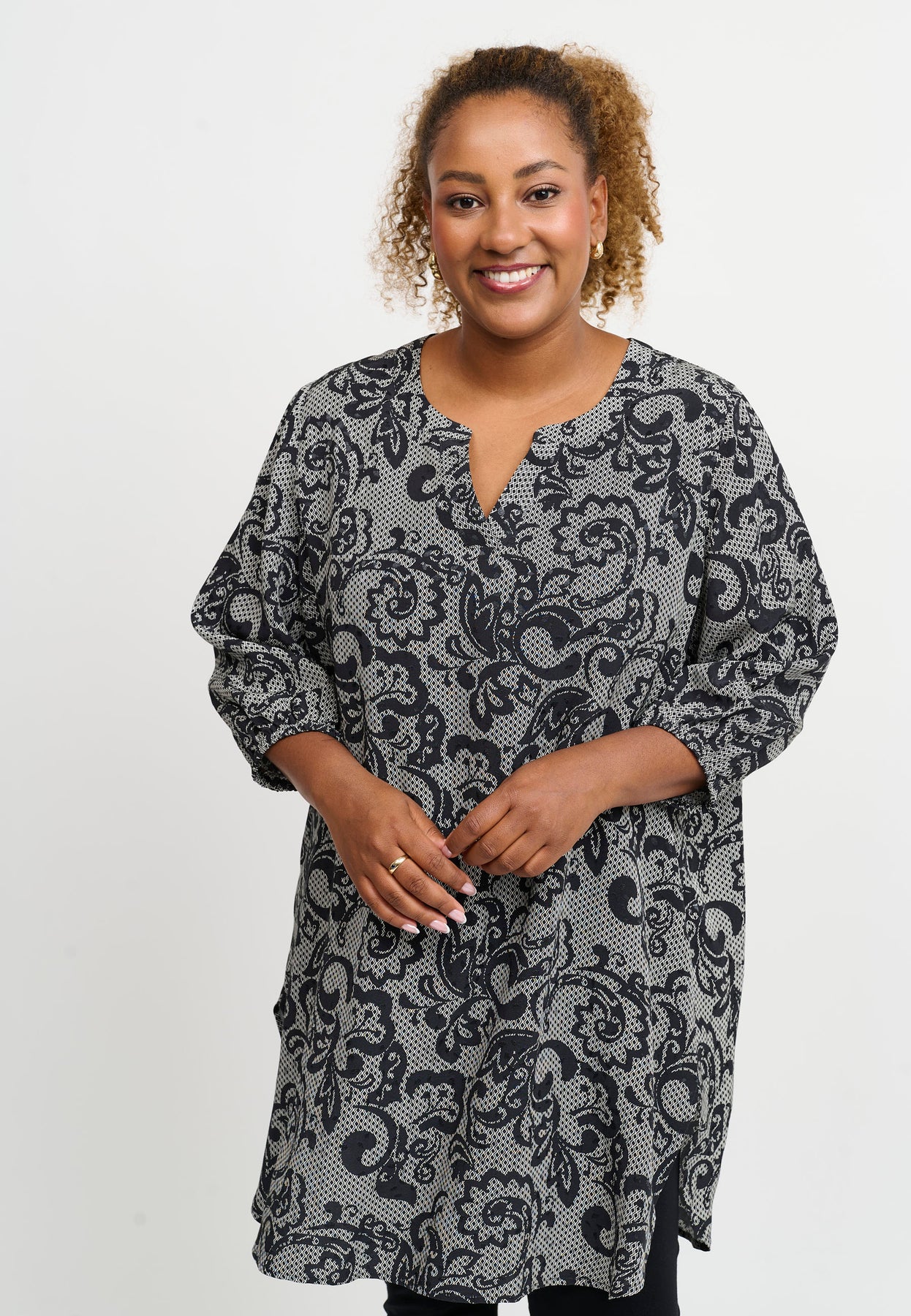 This classic viscose tunic is decorated with a hand-drawn, floral-inspired print in grey and white tones – a clean look with a personal touch. The relaxed fit features a round neckline and long sleeves, while the soft viscose quality ensures a smooth and comfortable feel against the skin.