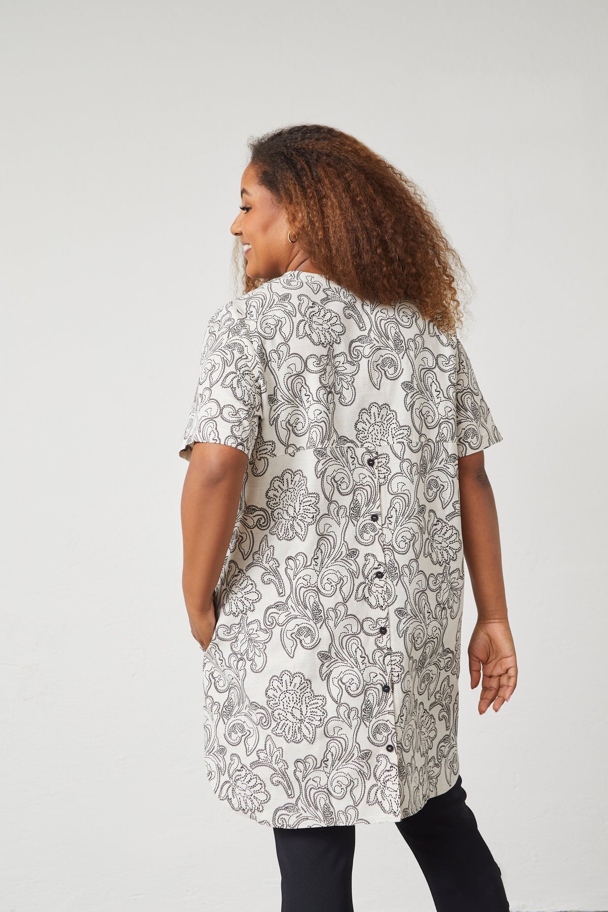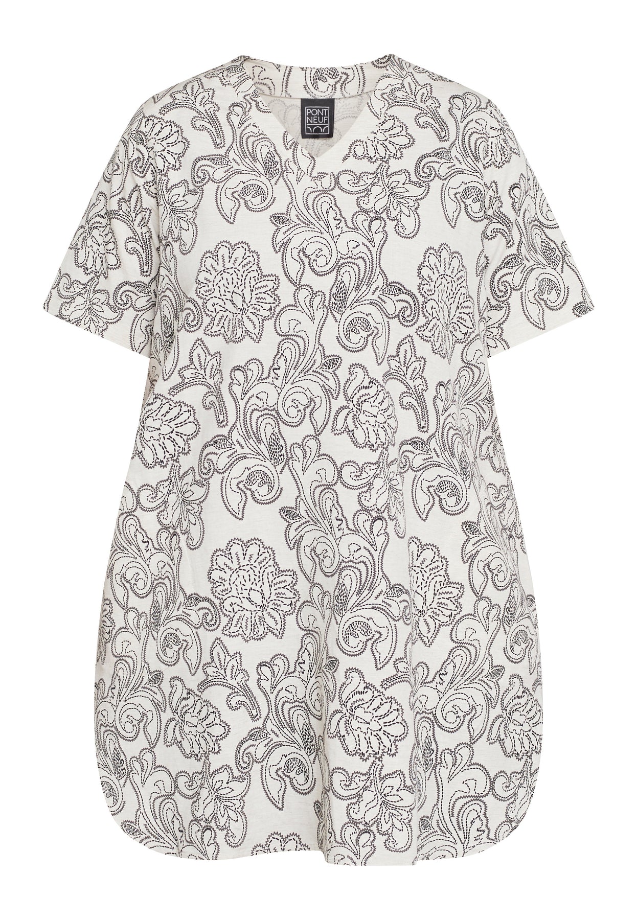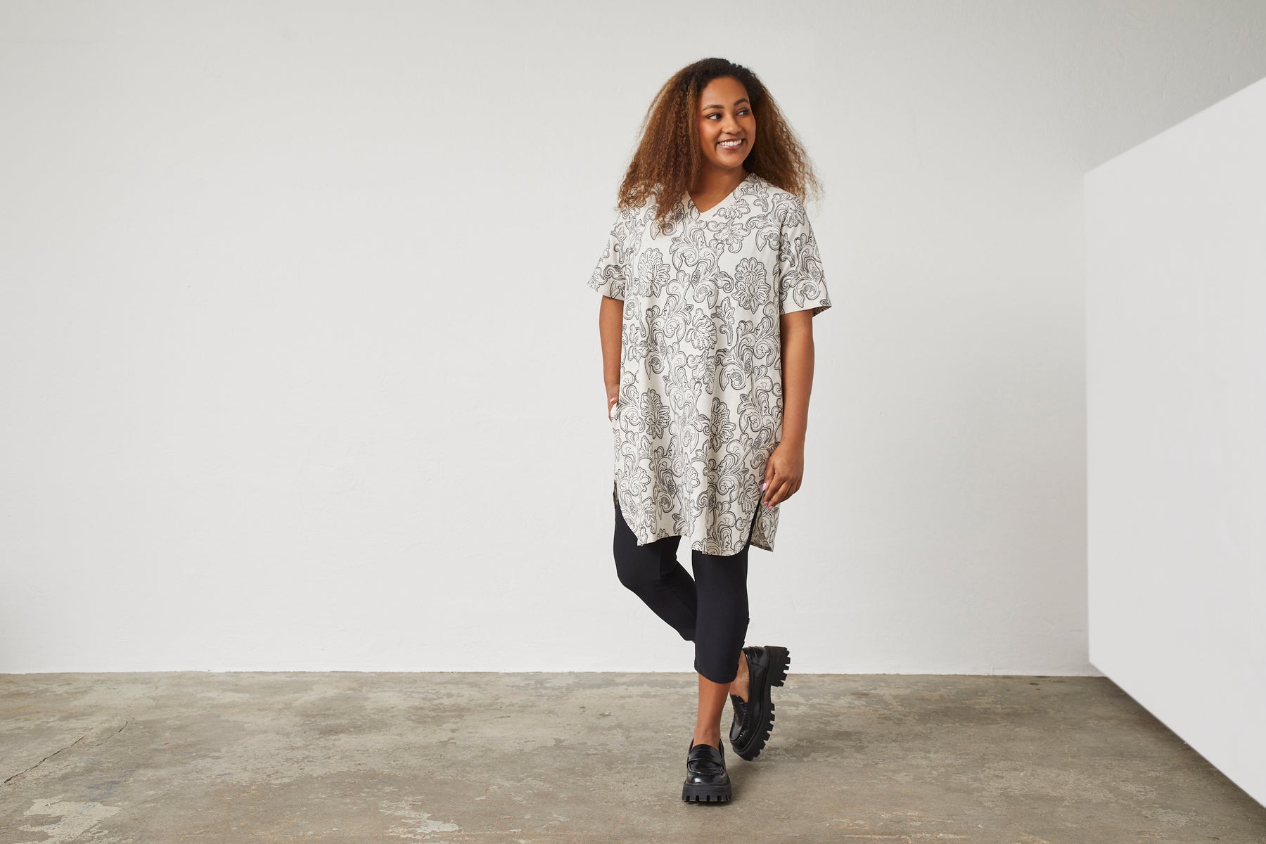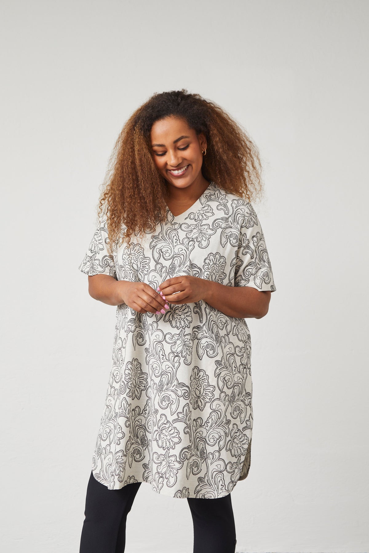 Regular price 899.00 DKK Sale price 629.30 DKK Save 30%There’s something light and breezy about this tunic with its beautiful graphic print. The relaxed A-shape, round neckline, and short sleeves create an effortless and feminine look. The fabric has a natural texture and feels wonderfully soft against the skin – ideal for warm days when comfort and style are equally important.