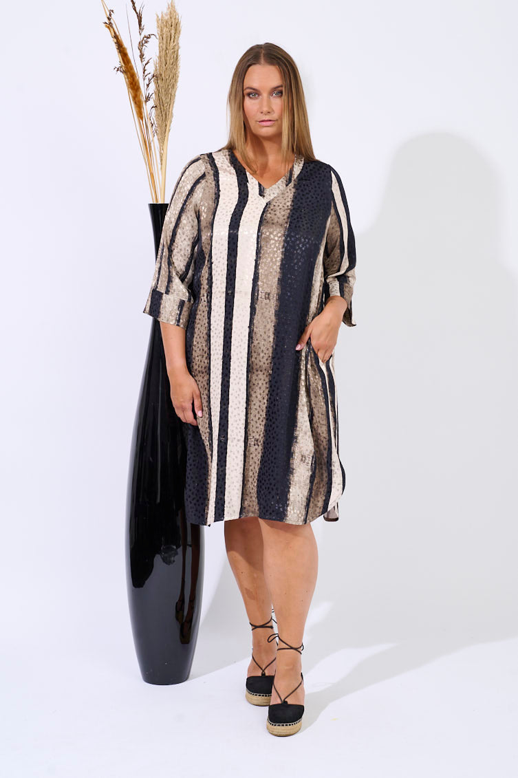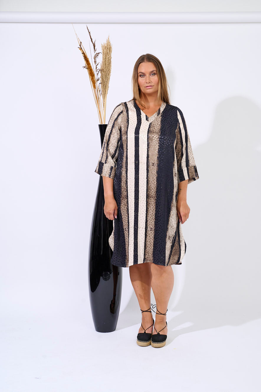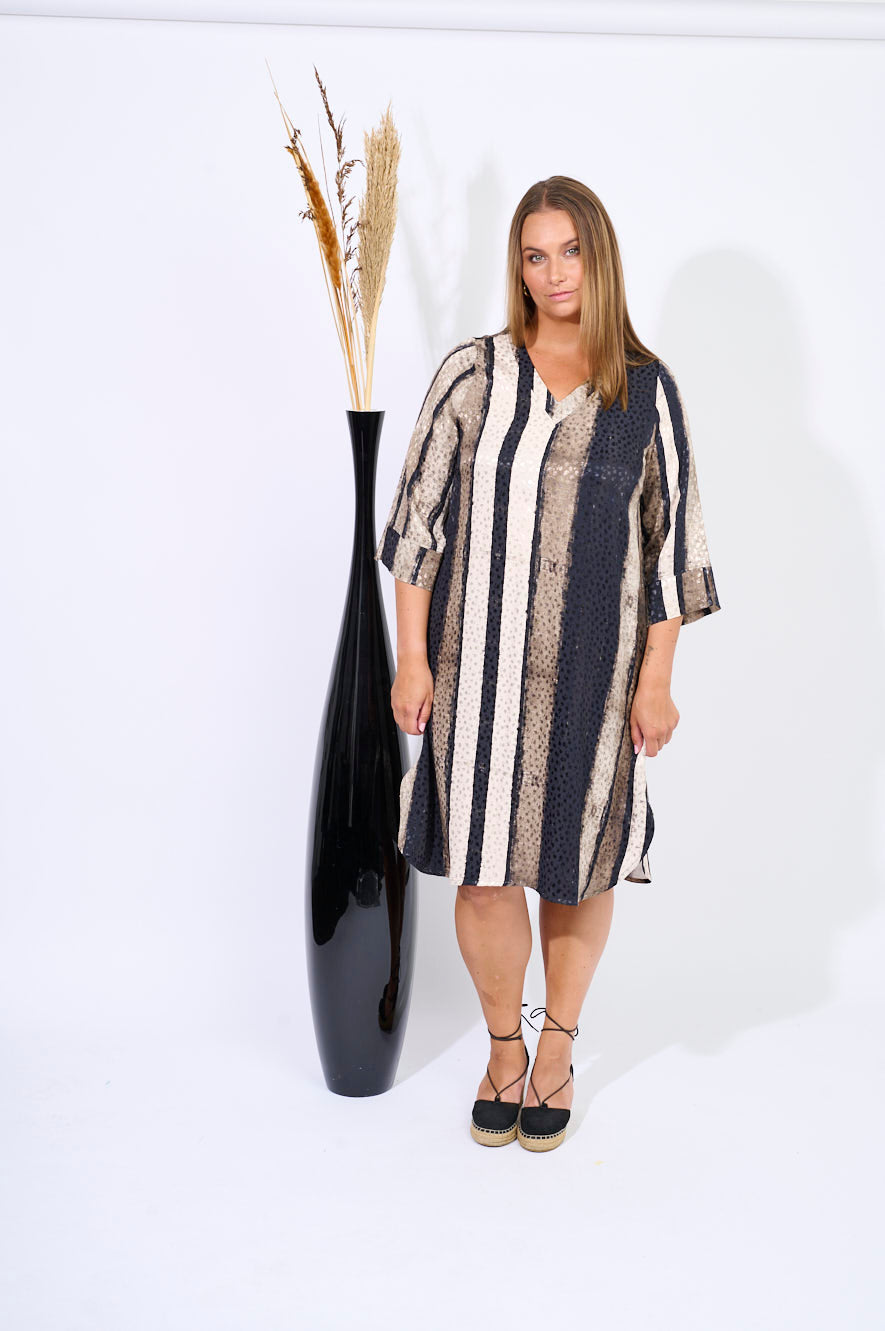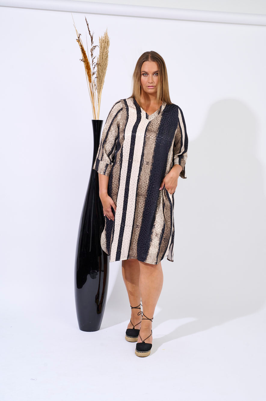 This dress from Pont Neuf features a graphic and modern look combined with a feminine, lightweight silhouette. It is made from soft viscose and designed with a bold vertical stripe pattern that creates an elegant and lengthening effect. The dress has a round neckline, short sleeves, and an A-shape fit that drapes comfortably around the body.
