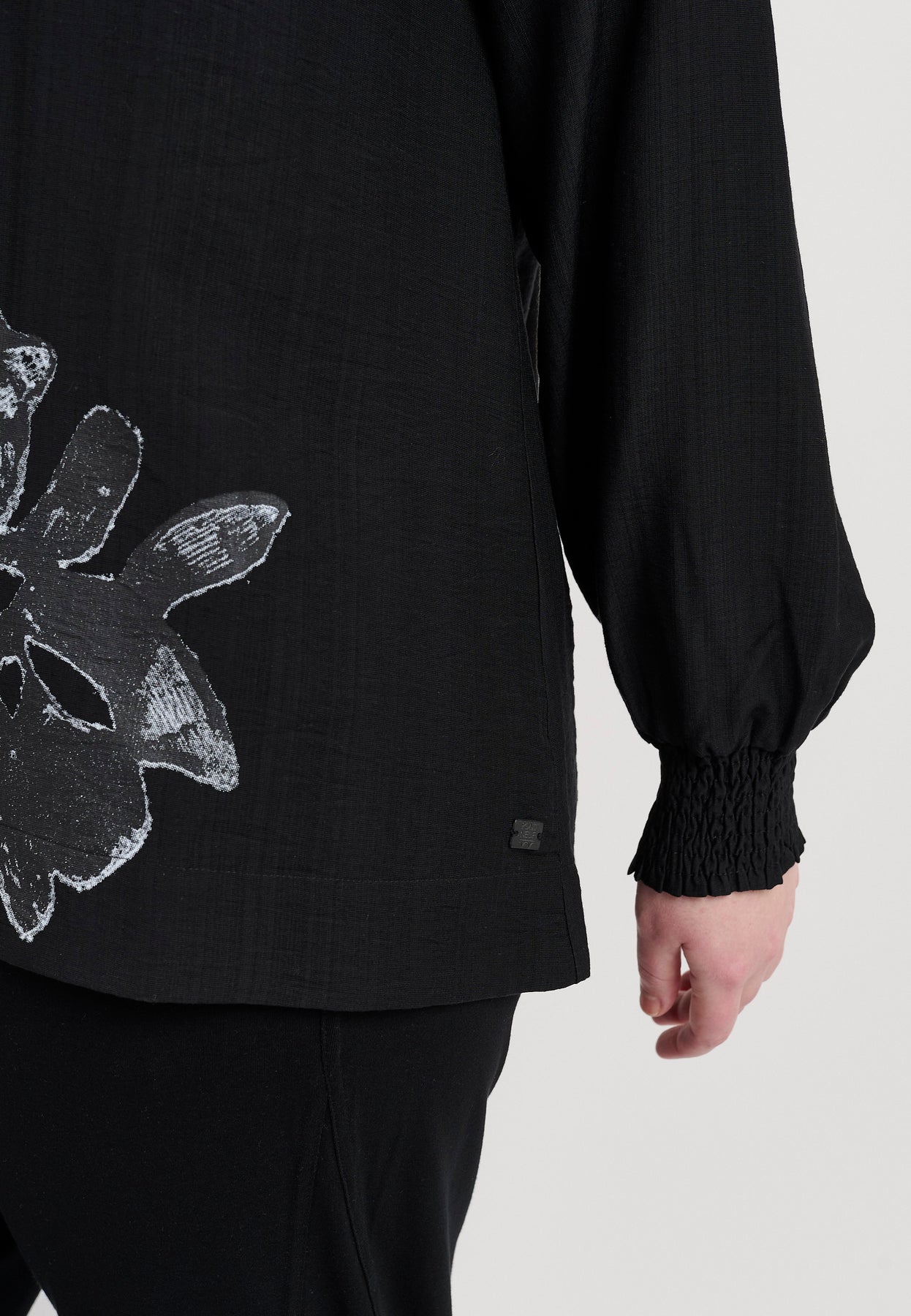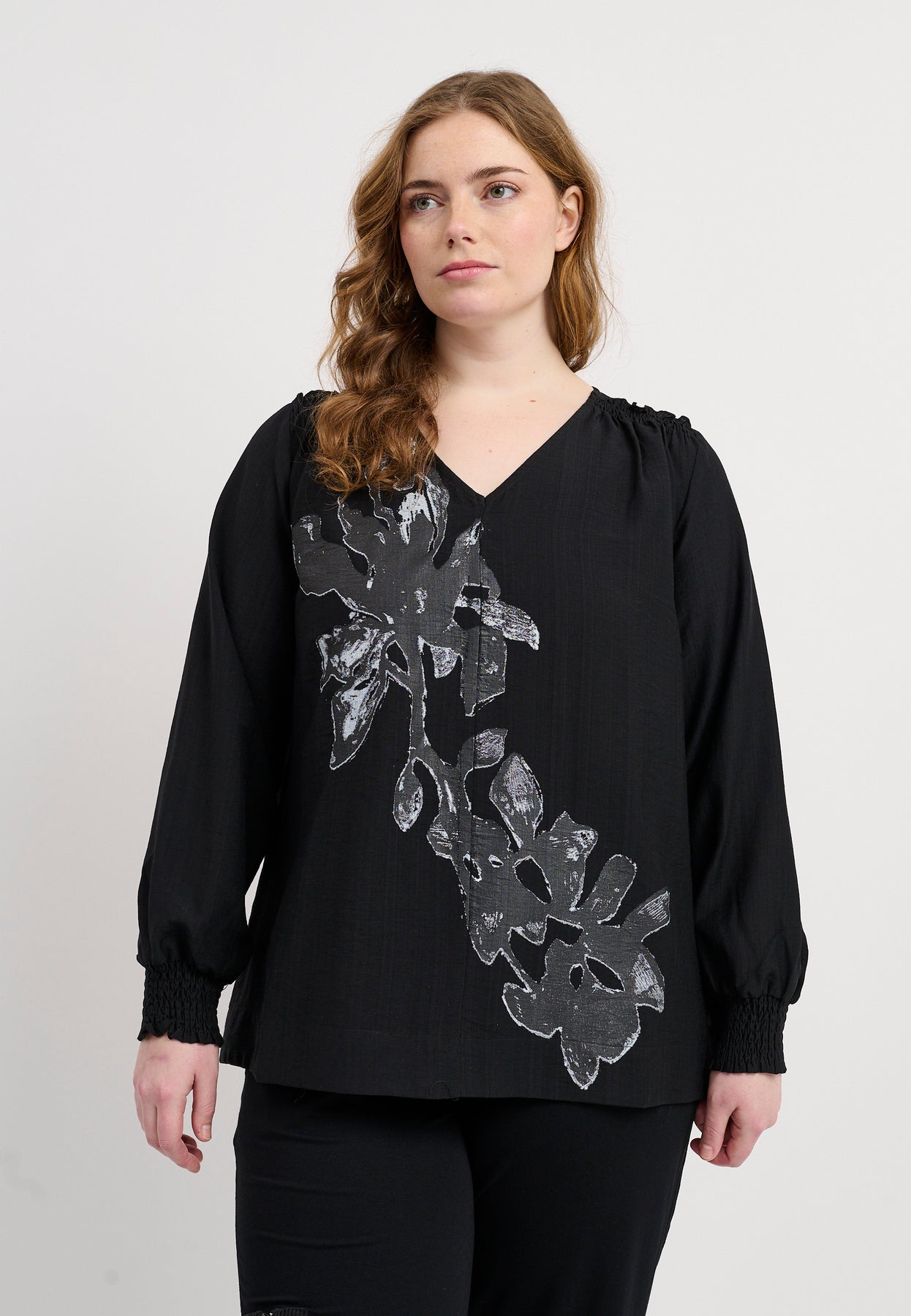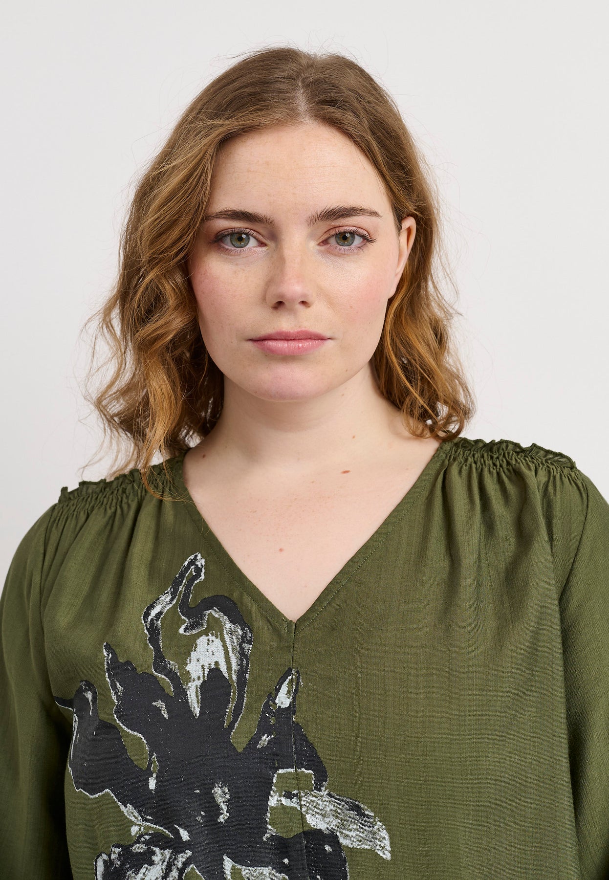 An elegant and stylish blouse with an artistic floral print across the front that adds personality and visual interest. The A-shaped fit ensures great comfort and freedom of movement, while the lightweight woven blend of viscose and nylon gives a soft, slightly shiny finish. The V-neckline and long, lightly puffed sleeves add a feminine and modern touch.
