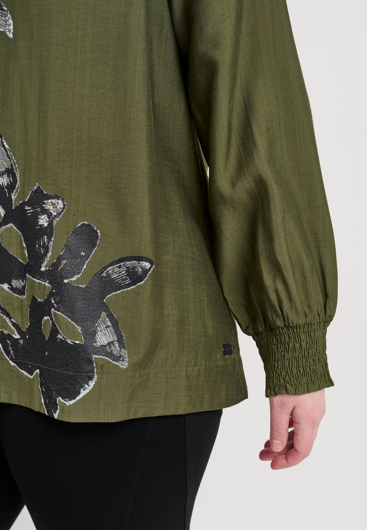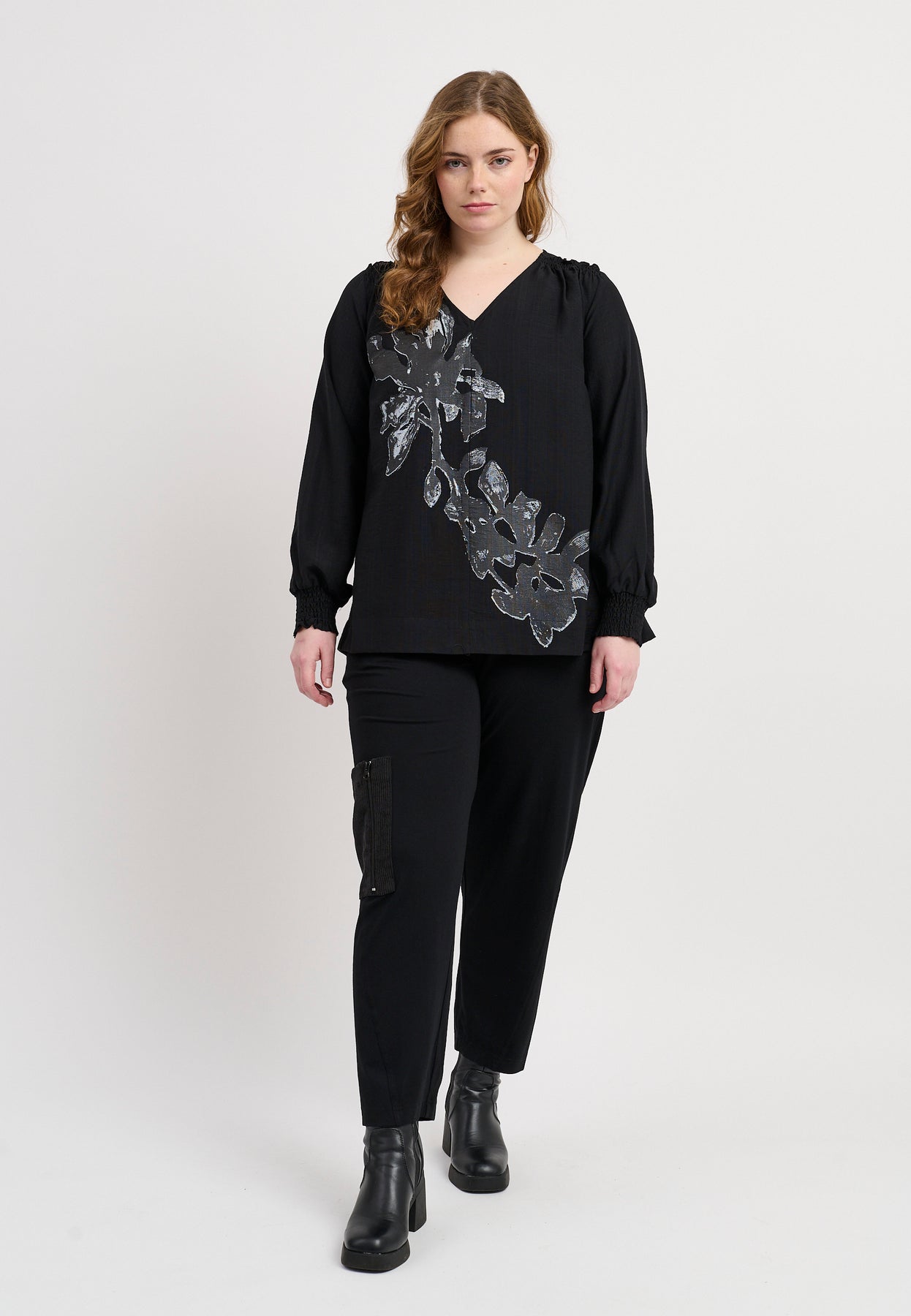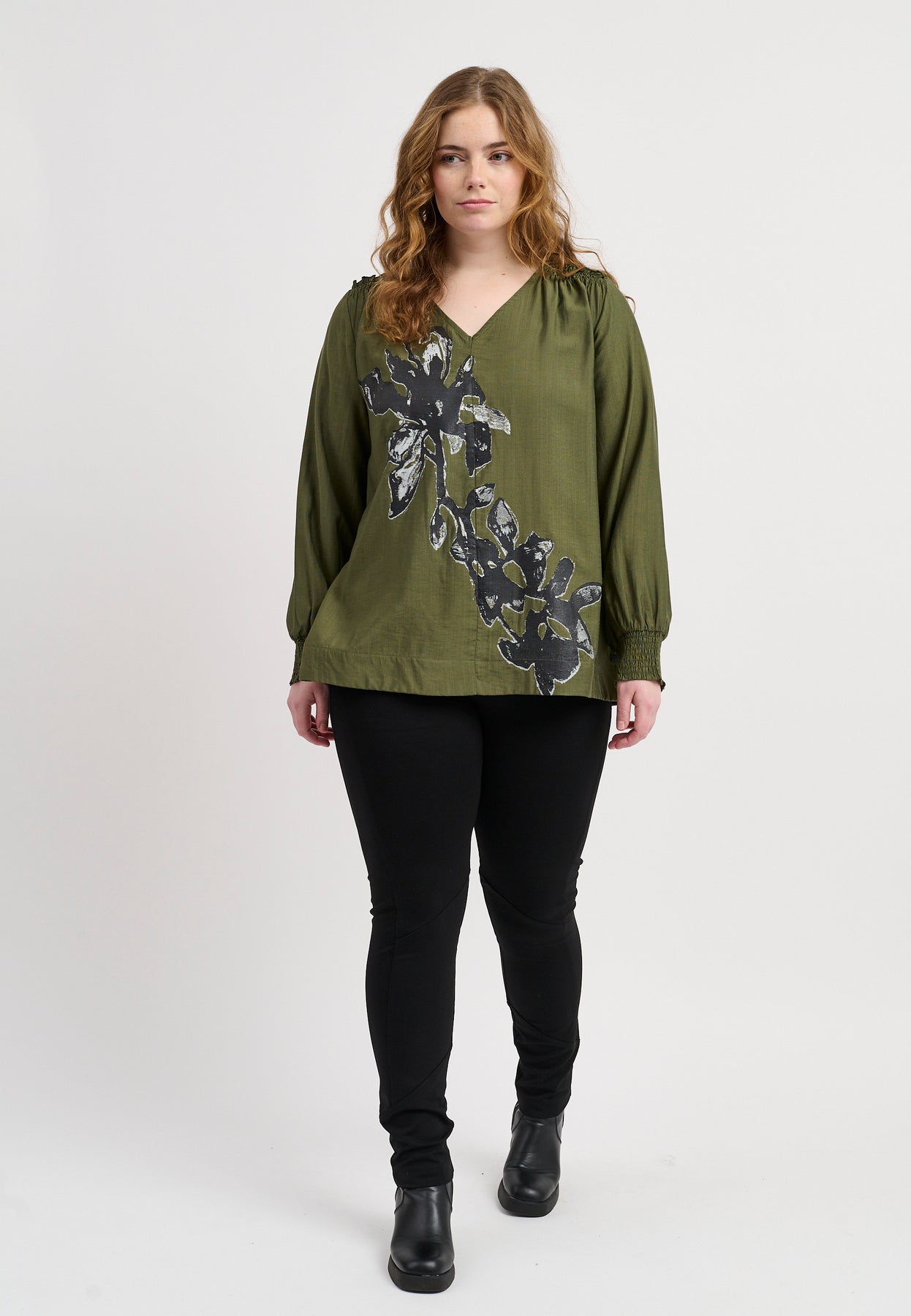 An elegant and stylish blouse with an artistic floral print across the front that adds personality and visual interest. The A-shaped fit ensures great comfort and freedom of movement, while the lightweight woven blend of viscose and nylon gives a soft, slightly shiny finish. The V-neckline and long, lightly puffed sleeves add a feminine and modern touch.