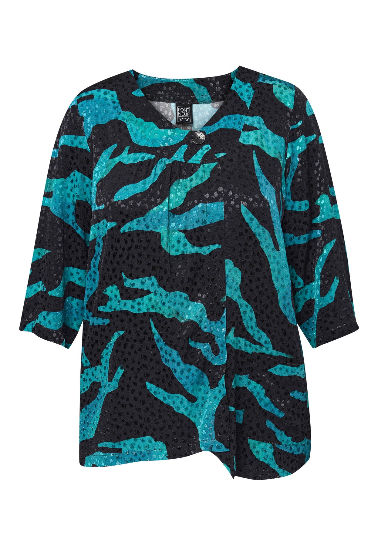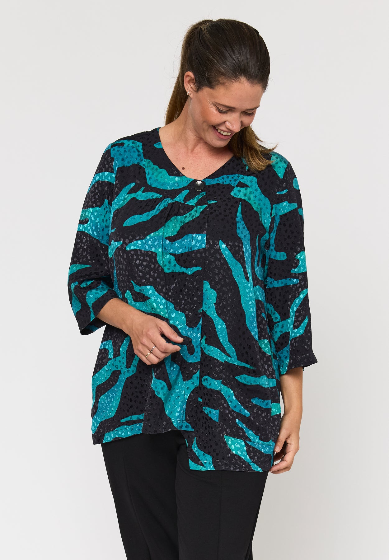 This blouse features a graphic print in contrasting shades of turquoise and black, creating a modern and striking look. The straight cut gives a clean silhouette, while the lightweight blend of rayon and viscose provides a beautiful drape and comfortable feel. A blouse that both catches the eye and feels effortless to wear.