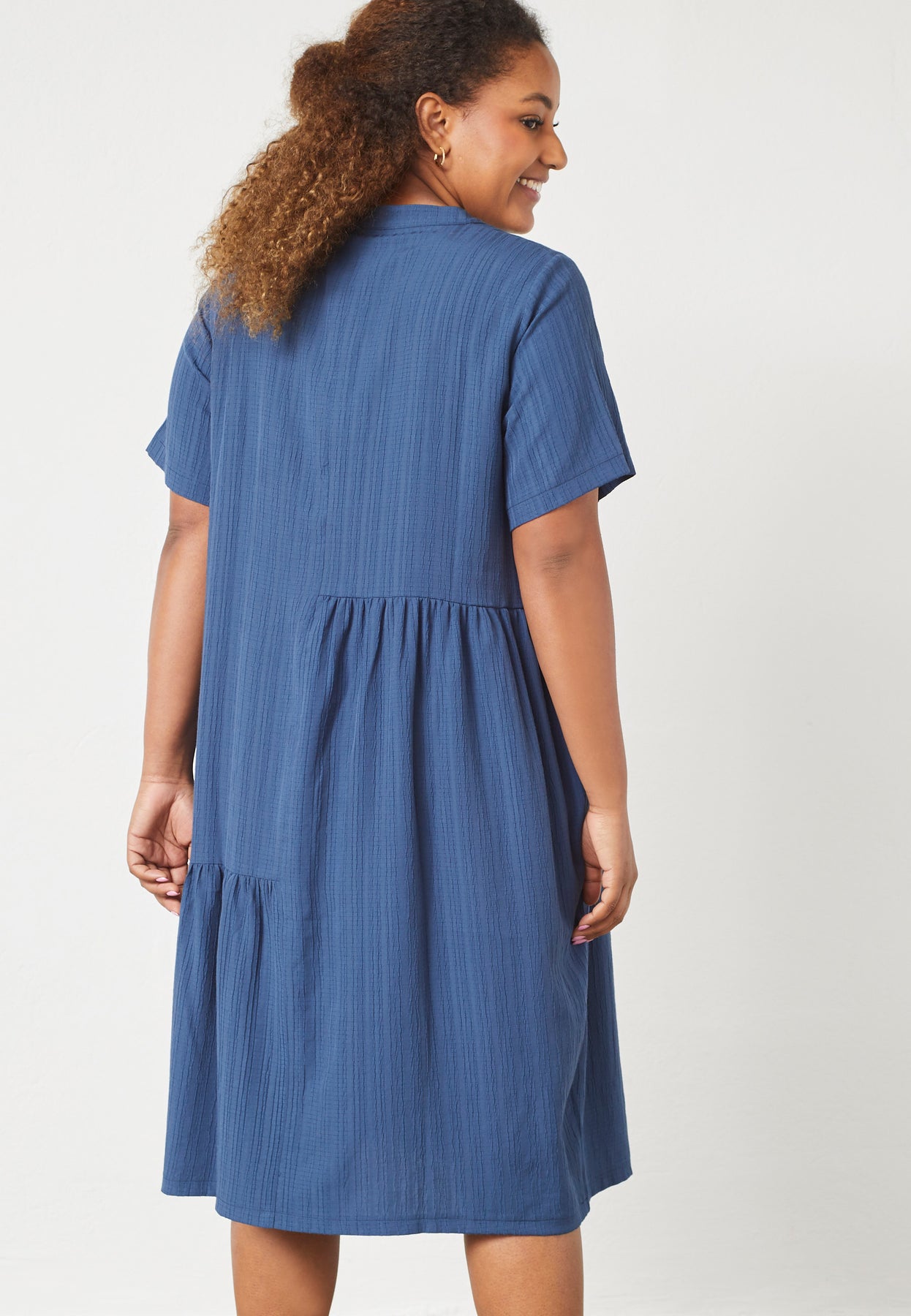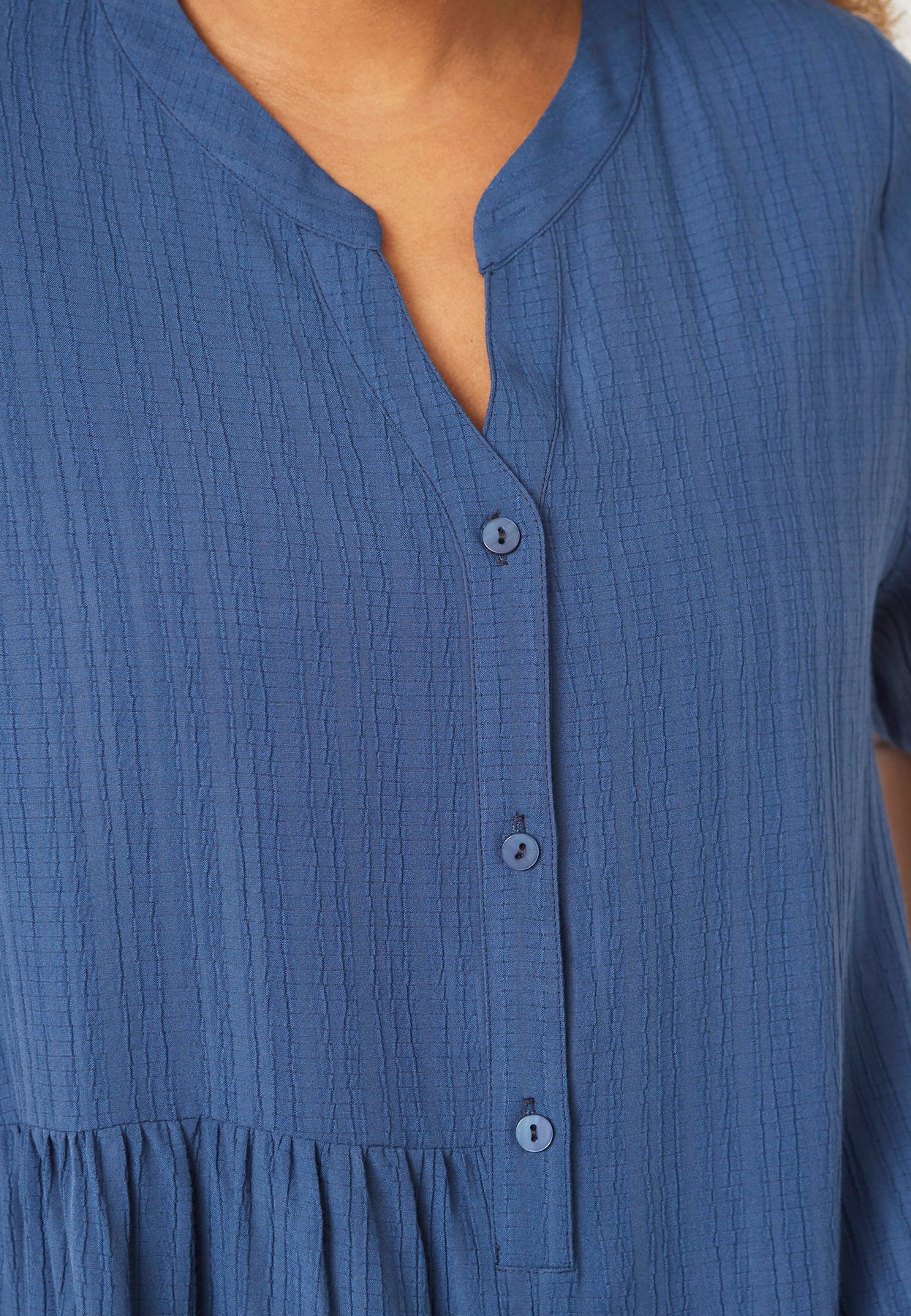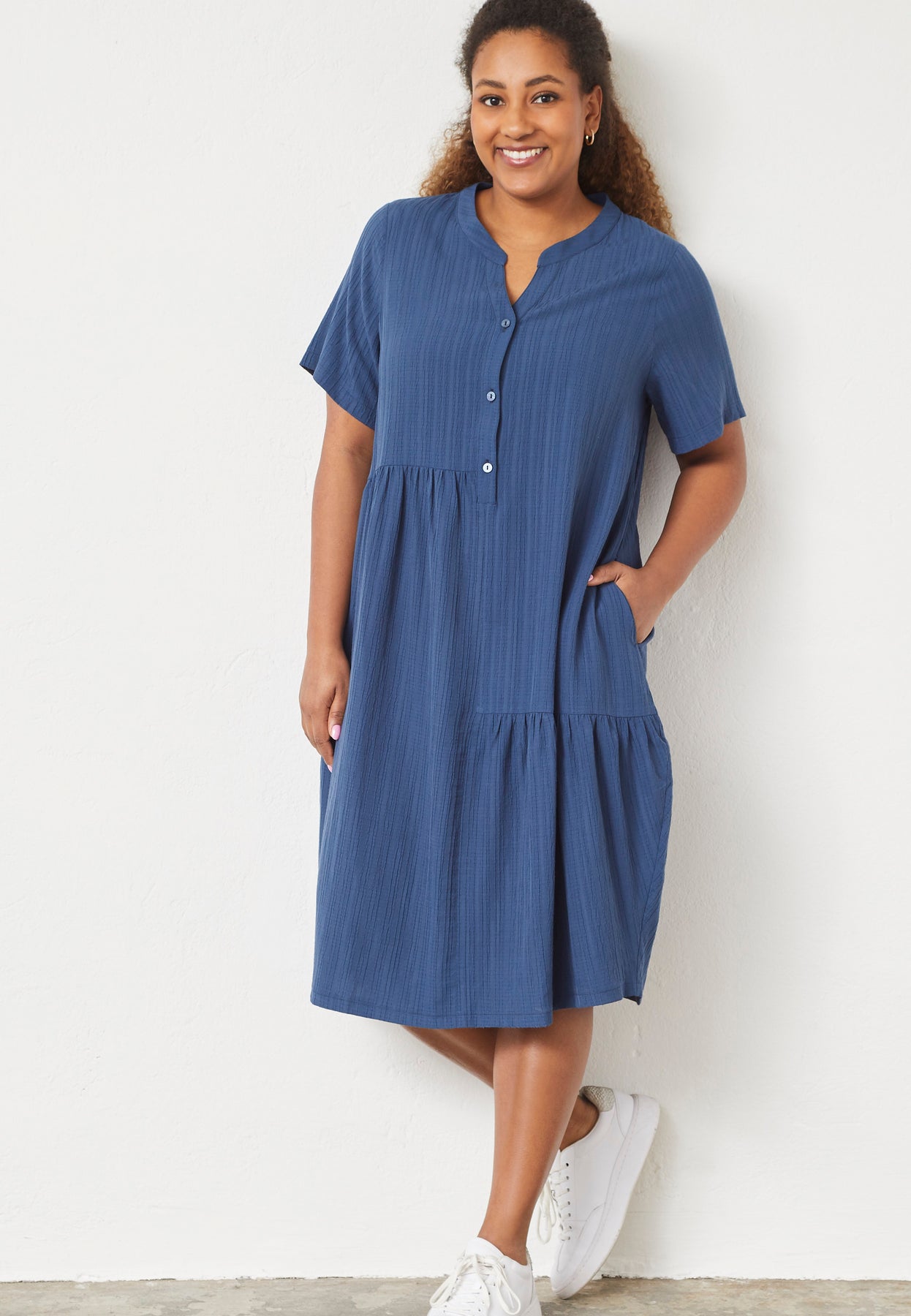 A light and airy dress with a relaxed fit and feminine details. The soft fabric ensures a comfortable feel, while the loose A-shape cut creates a flattering drape. Small buttons and subtle stitching add an elegant touch to the simple design.