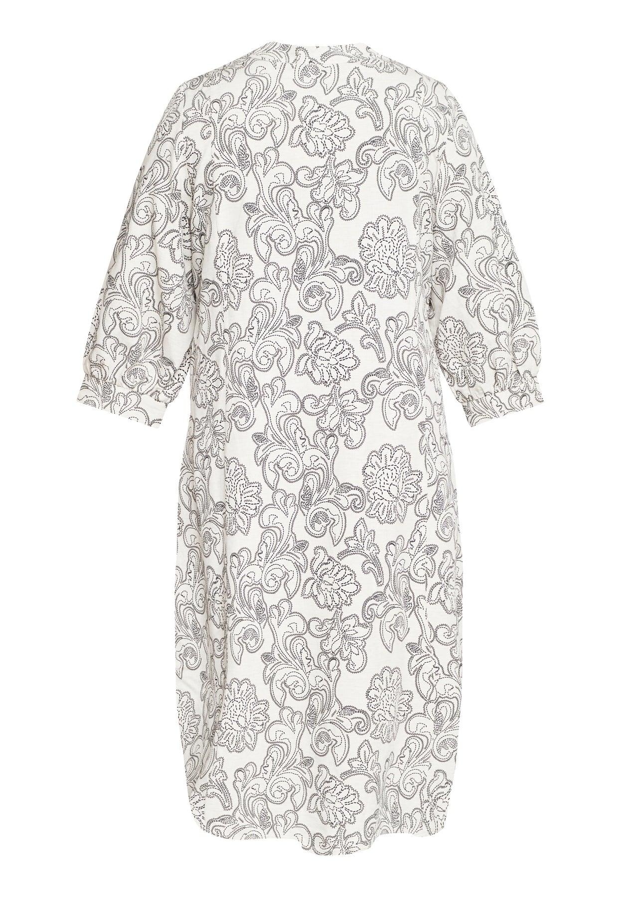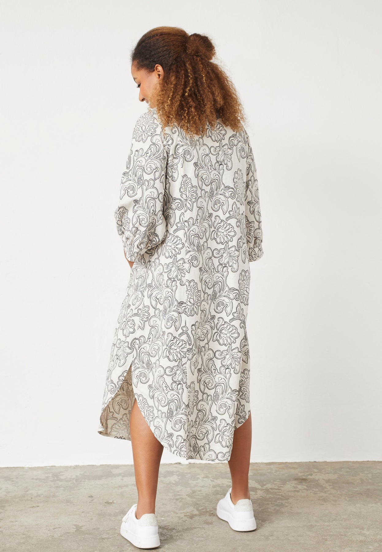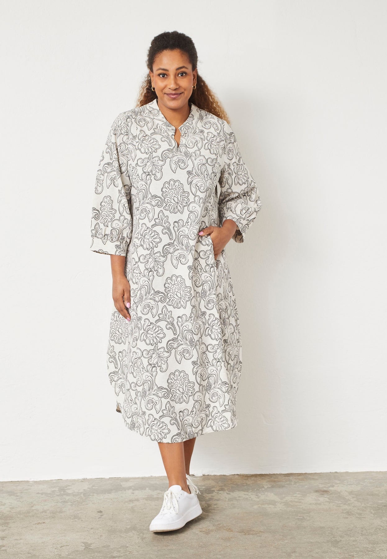This long dress blends elegance with comfort and a relaxed feel. The lightweight viscose-linen blend makes it breathable and pleasant to wear, while the A-shape fit creates a graceful drape. The dress features subtle buttons, a classic shirt collar, and long sleeves with a relaxed volume that enhances the modern look. The delicate pattern adds a feminine touch, making it perfect for both everyday wear and special occasions.