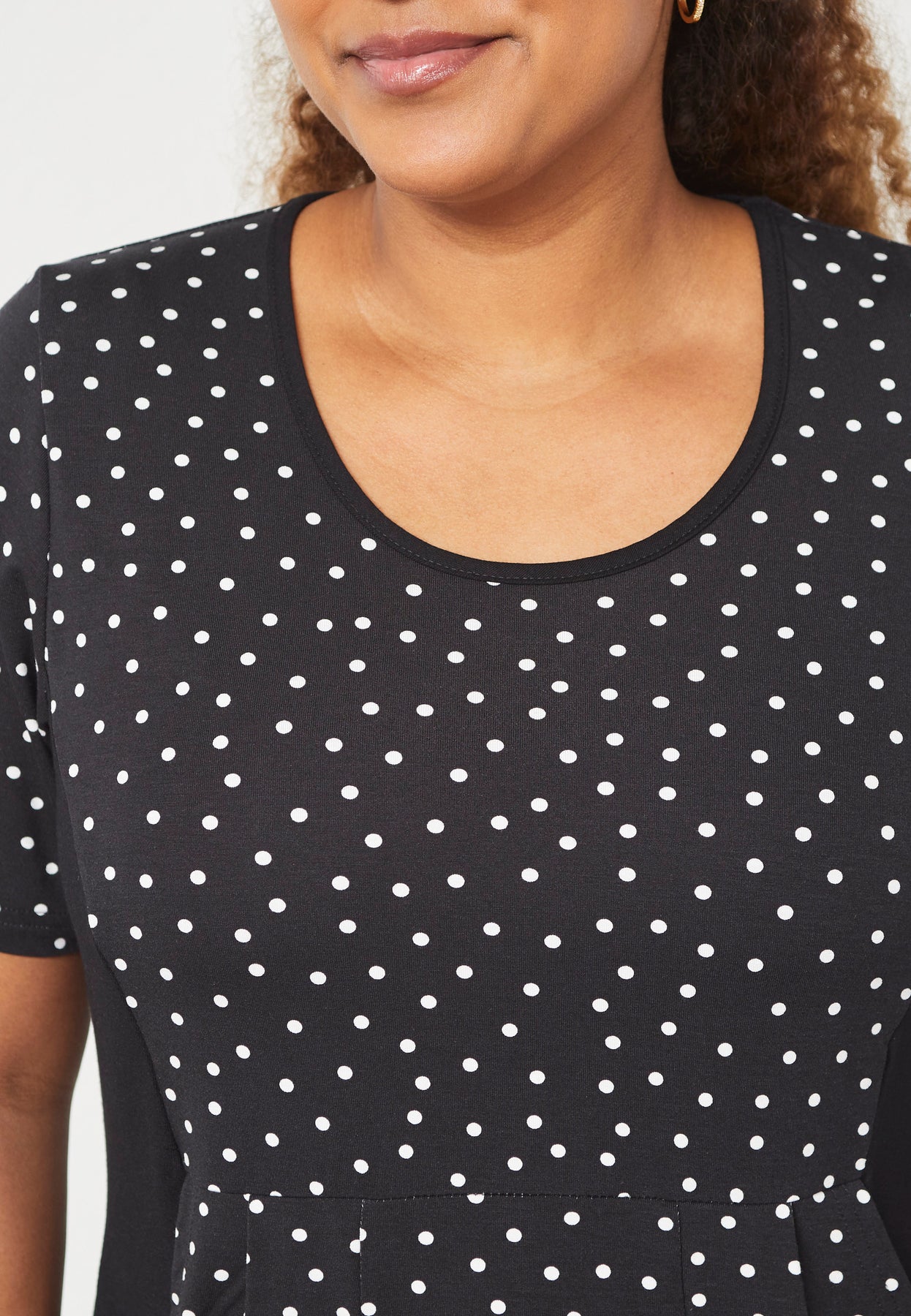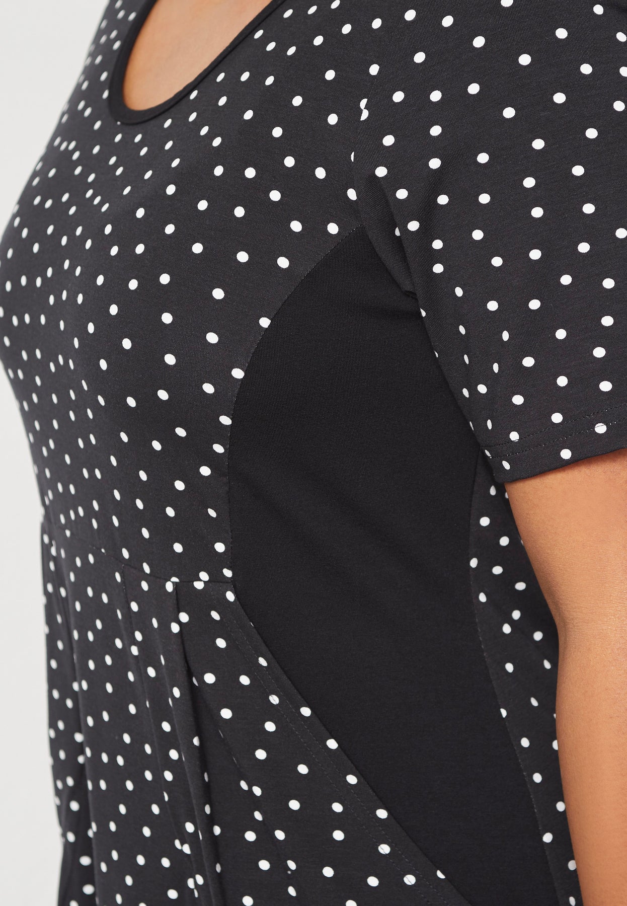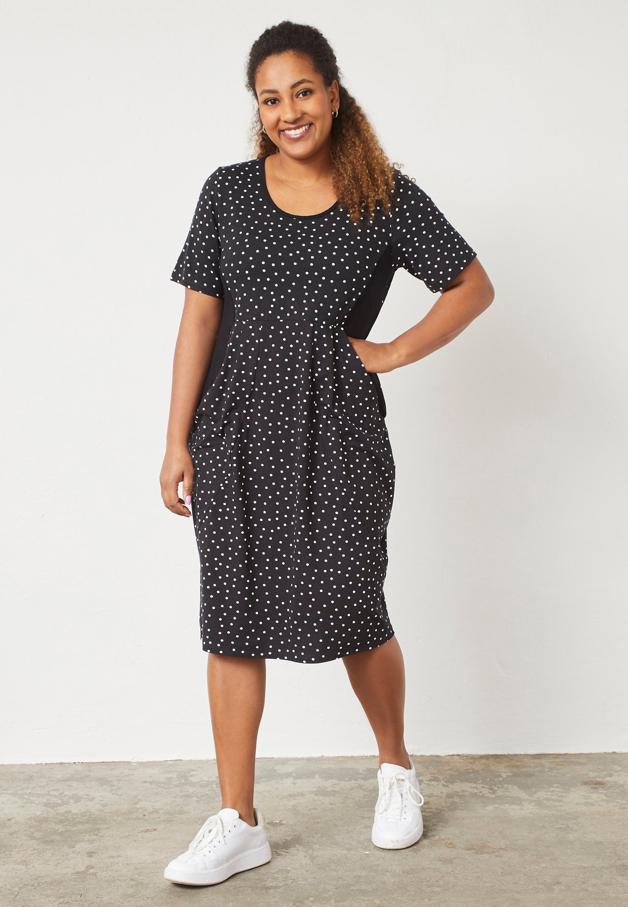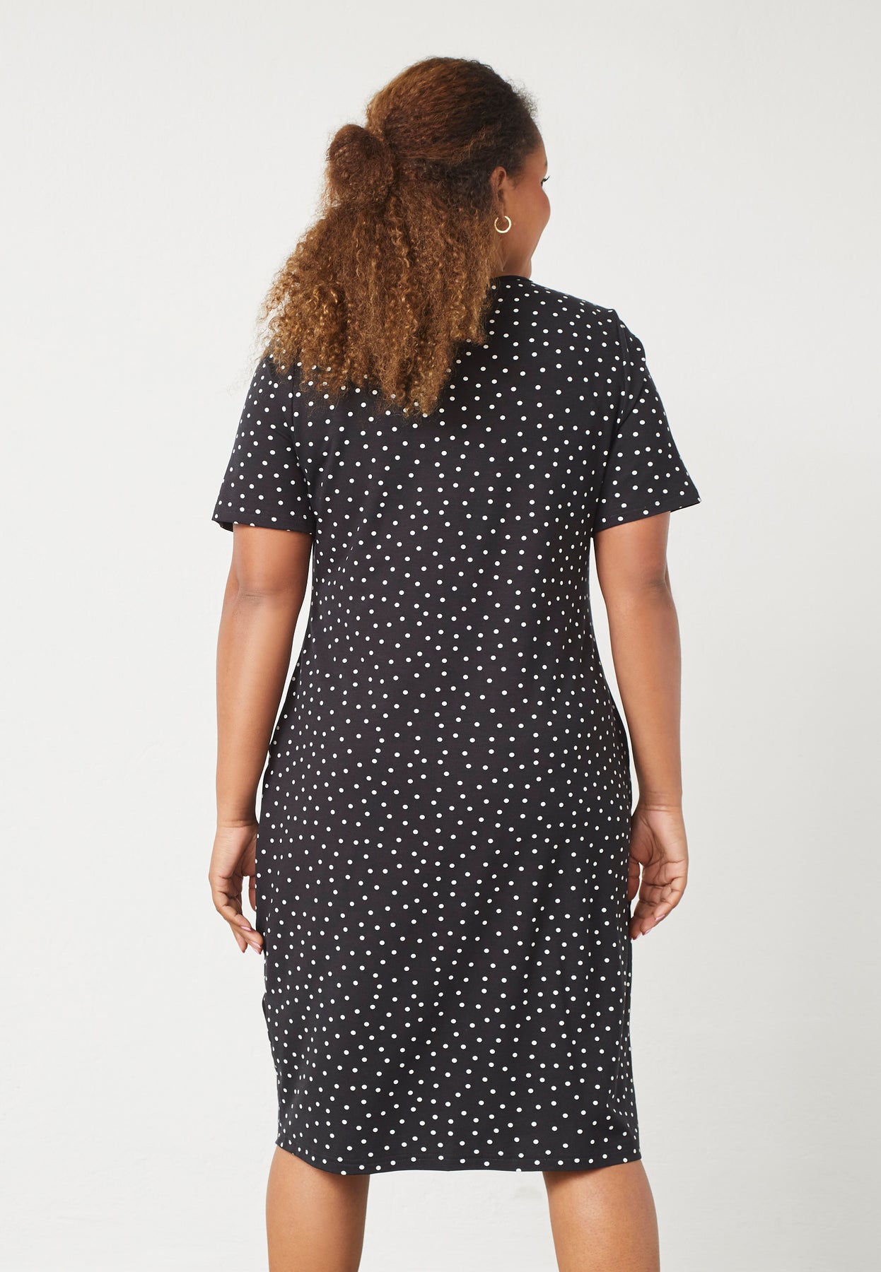 A simple yet stylish dress with a relaxed fit and a subtle pattern. The slightly stretchy fabric ensures comfortable movement, while the balloon-effect skirt adds a feminine and modern touch. The short sleeves and round neckline emphasize the timeless design, making it easy to dress up or down for any occasion.