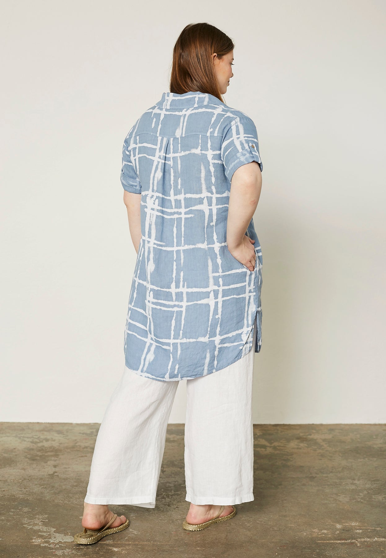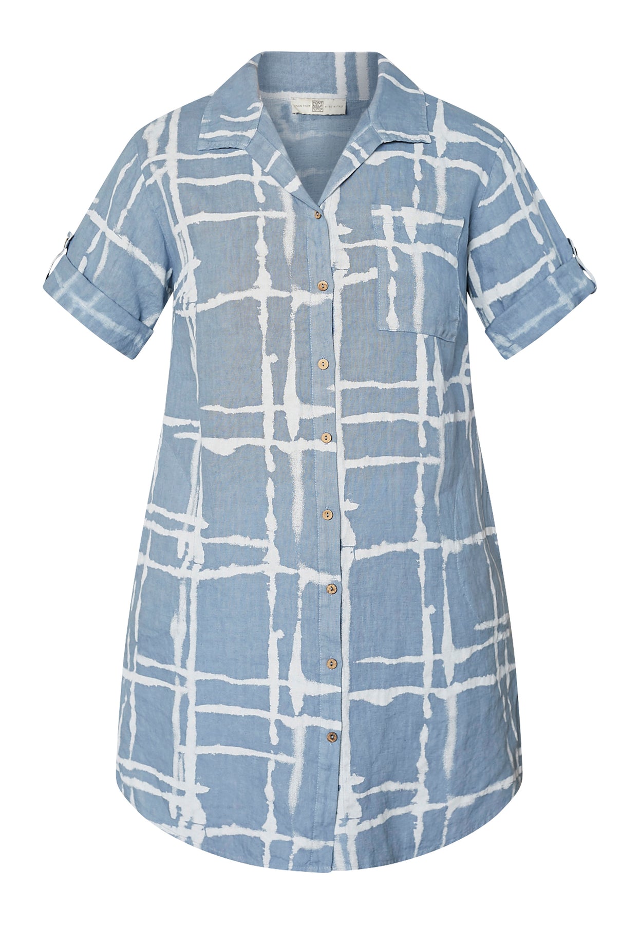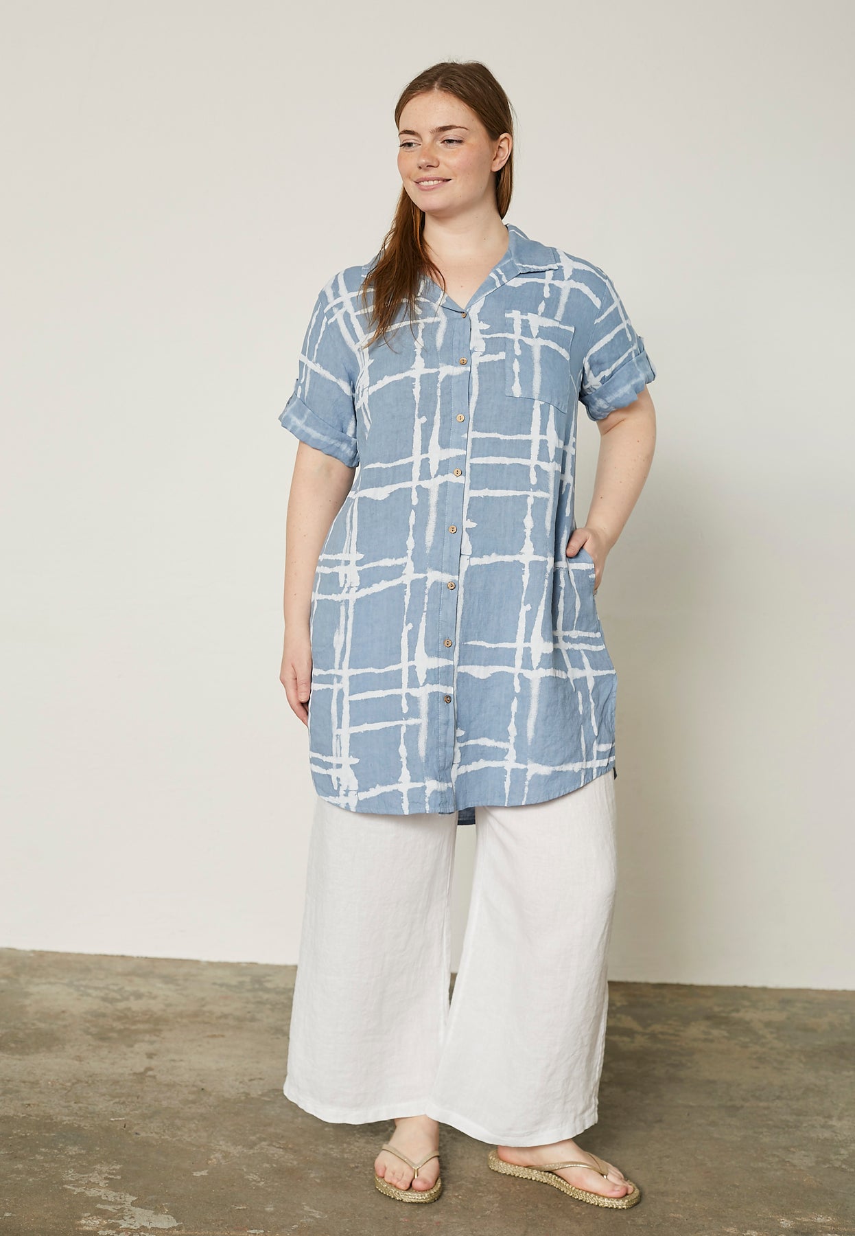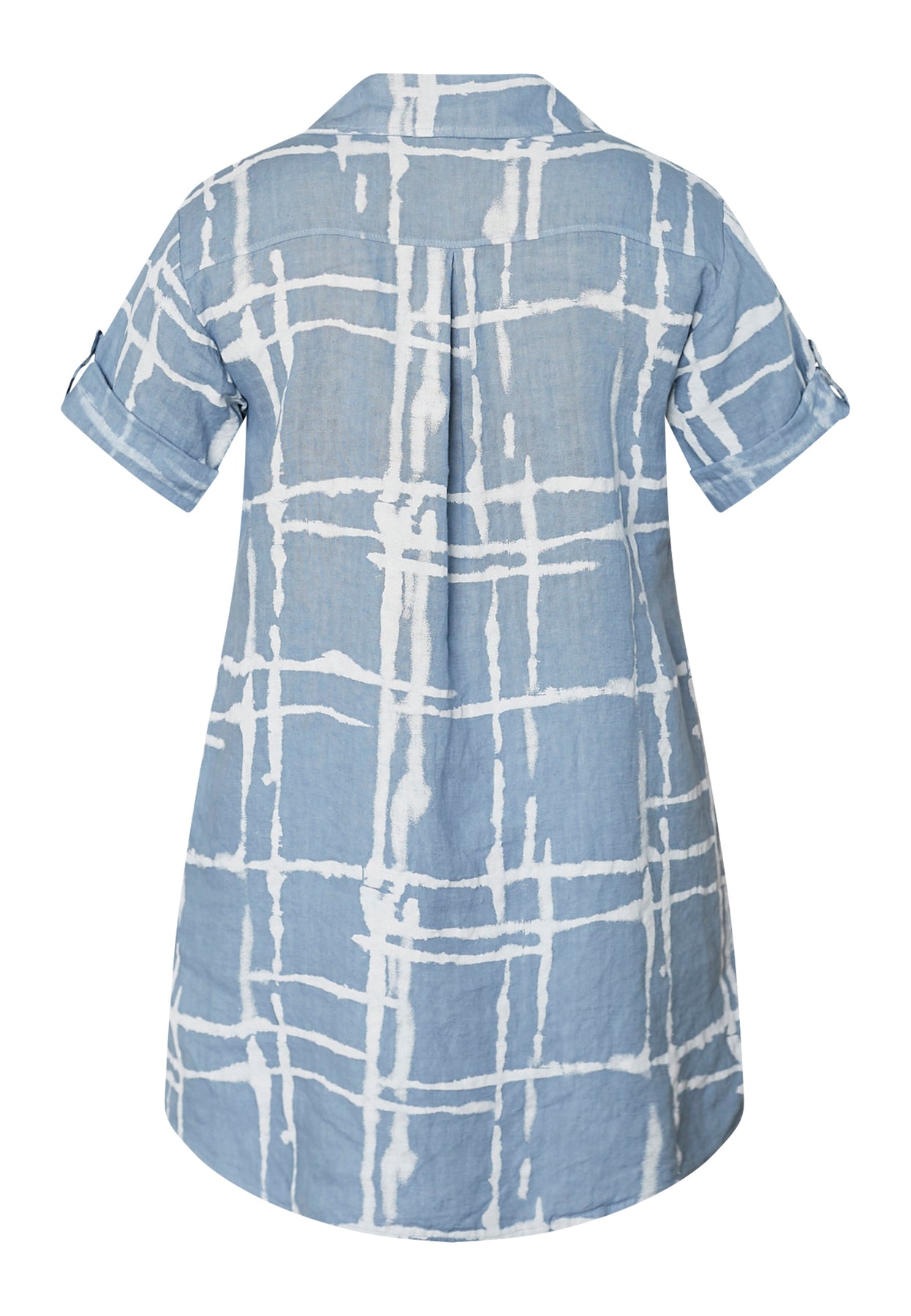 A stylish dress featuring a classic shirt collar and short sleeves. The model has a straight silhouette and a modern checked design that creates a fresh expression. The pure linen quality adds a natural lightness to the fabric, making the dress airy and comfortable on warmer days.